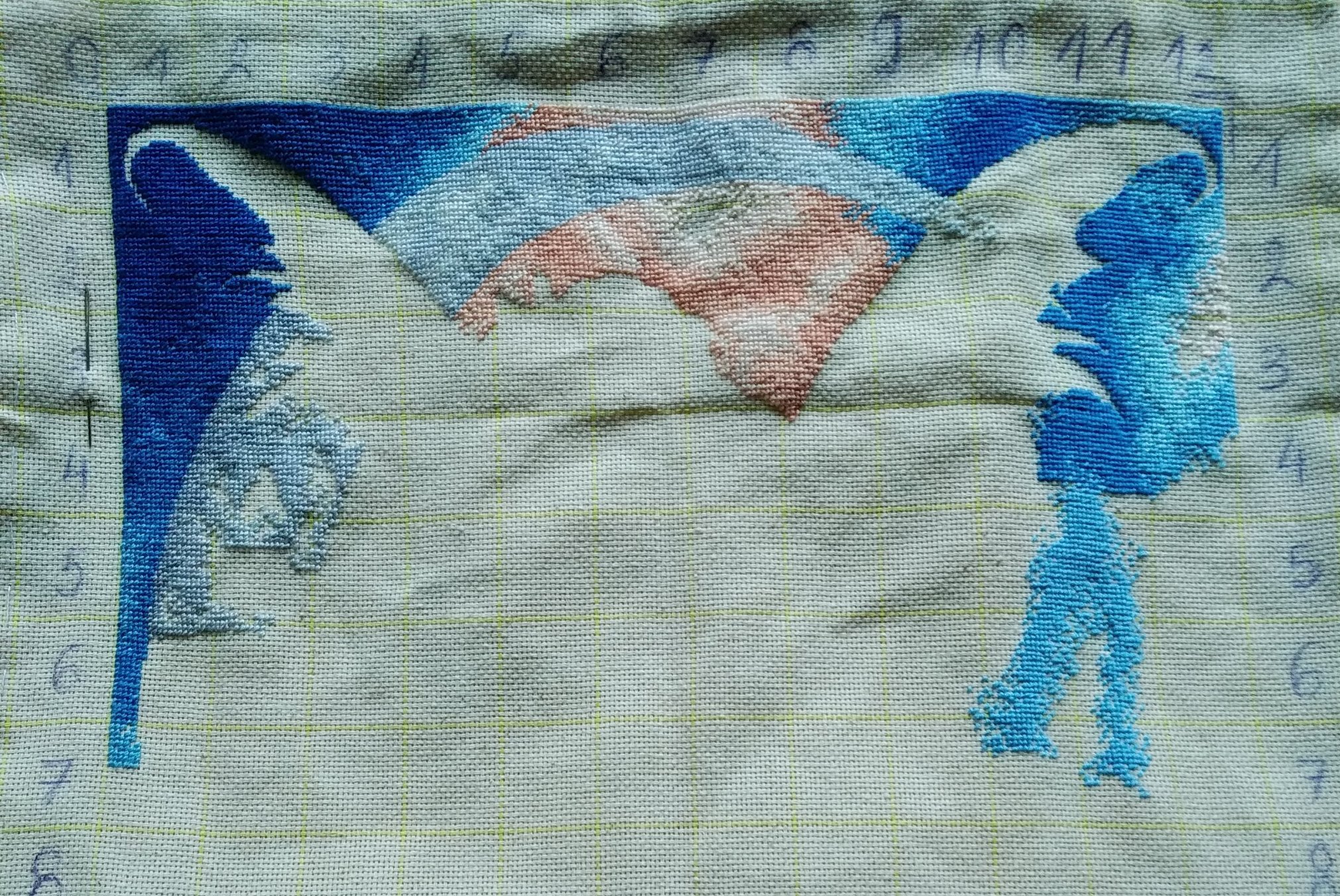 За започването на гоблена - въпреки, че в инструкциите пише, че най-правилно е да се започва от средата, на мен ми е най-удобно от долен ляв ъгъл да почвам. Но сегашния гоблен го почнах от горен десен, просто така, да видя как е. Но ми е определено по-странно и повече мачкам панама като че ли. Да не говорим, че ми се струва, че и шиенето е по-бавно така Simple Smile Всичко е в главата, разбира се.