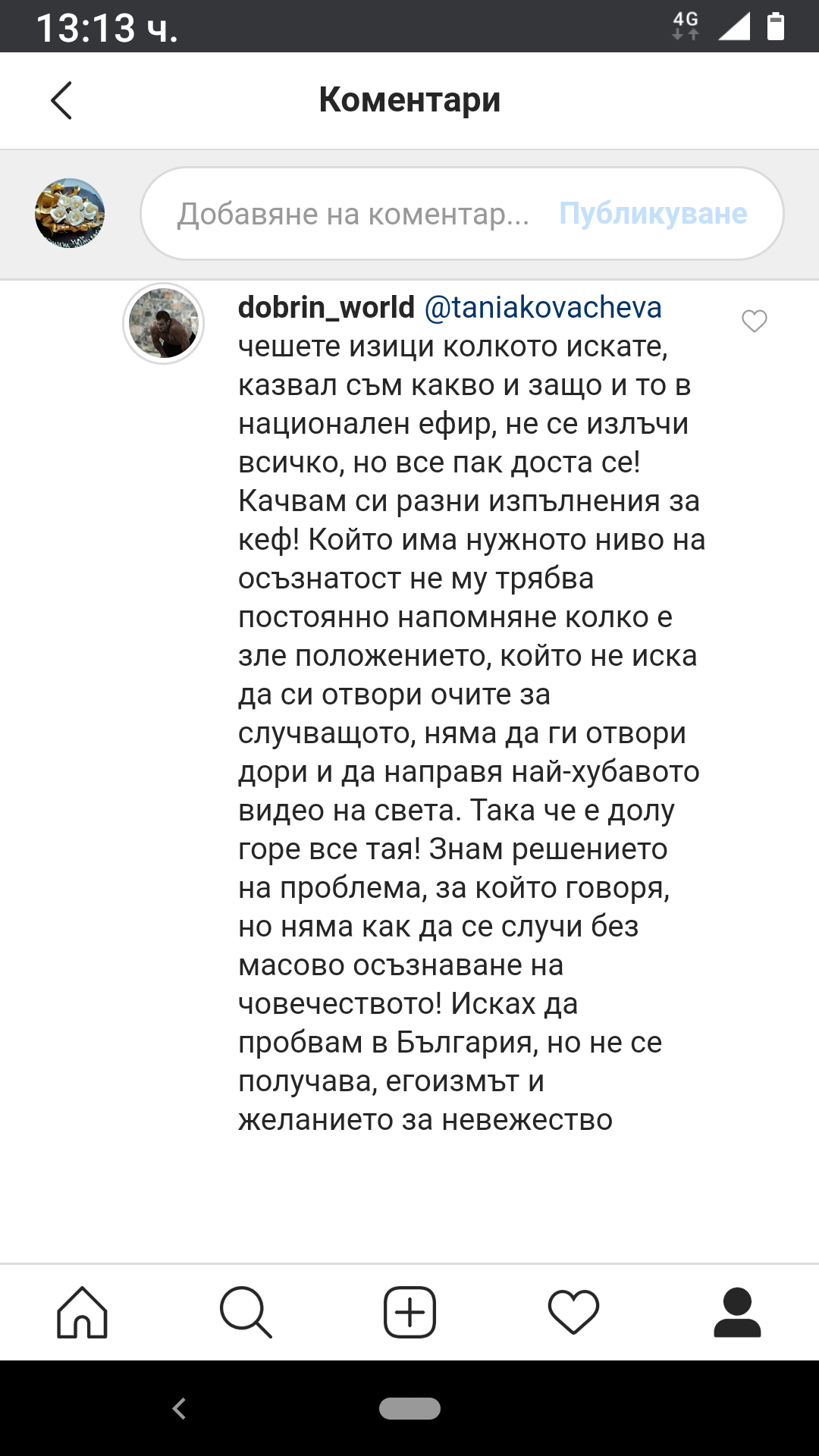 Сега пак малко от моя любимец Добрин. С Анита вече качват едни и същи сторита. Под снимките му стои Добрин , Sofia. Сега ще трябва и втора сватба да обсъждаме. Но най притеснителни за мен са думите на Добрия човек,че в България нищо не ставало. Опитал ама не се получавало.  Та ме хвана страх да не би и той като Веско да ни изостави.