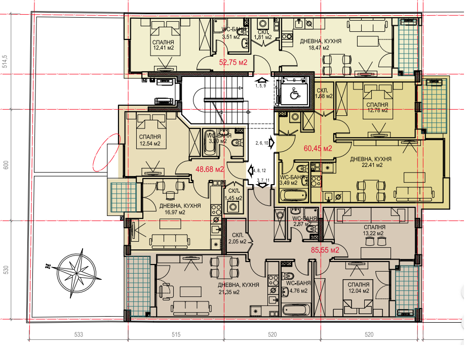 Имам нужда от мнението ви и се надявам на съдействие. Прикачам идейно разпределение на апартаменти в бъдеща сграда. Мога да предложа промени. Целта е жилища до 200 кв. м. (без общите части, както са в плана) за моето и на брат ми семейства. Със сигурност искаме 1 тристаен и за останалото съм силно разколебана - още един тристаен или два двустайни, които ако решим да могат да се свържат и да се получи отделна кухня.