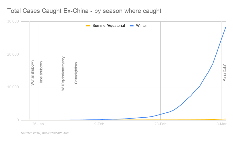 Мисля се вижда, че растежа на случаите в летни държави е нищожен в сравнение с този в зимни.