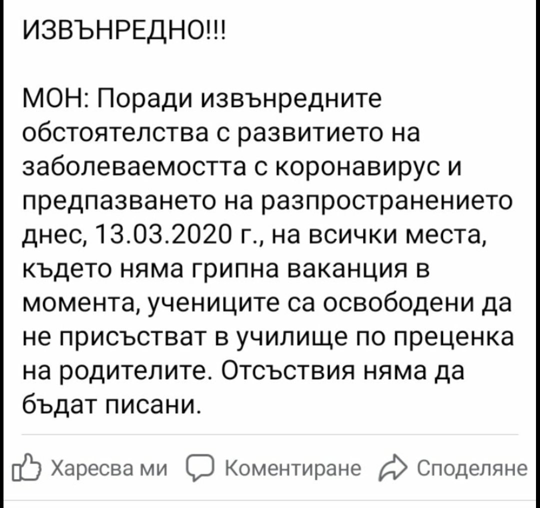 Поради извънредните обстоятелства с развитието на заболеваемостта с коронавирус и предпазването на разпространението днес 13.03. 2020 на всички места, където няма грипна ваканция в момента, учениците са освободени да не присъстват в училище по преценка на родителите.