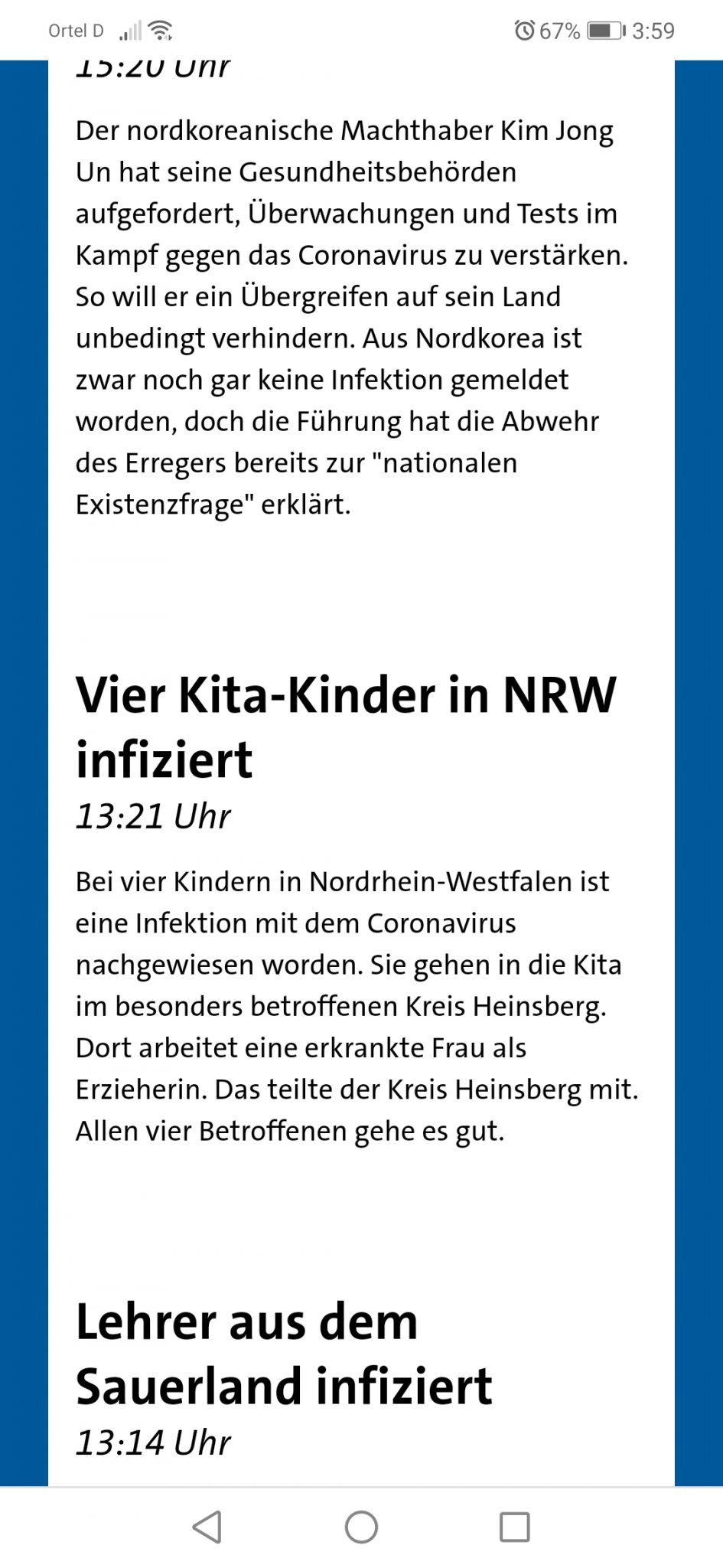 За четирите заразени деца в NRW писахте ли? Една фрау, която рабори в детската градина ги заразила. Пак е в Хайнзберг. Има и заразен учител в Зауерланд, което е на няколко километра от работата ми и поне пет колежки са от там.