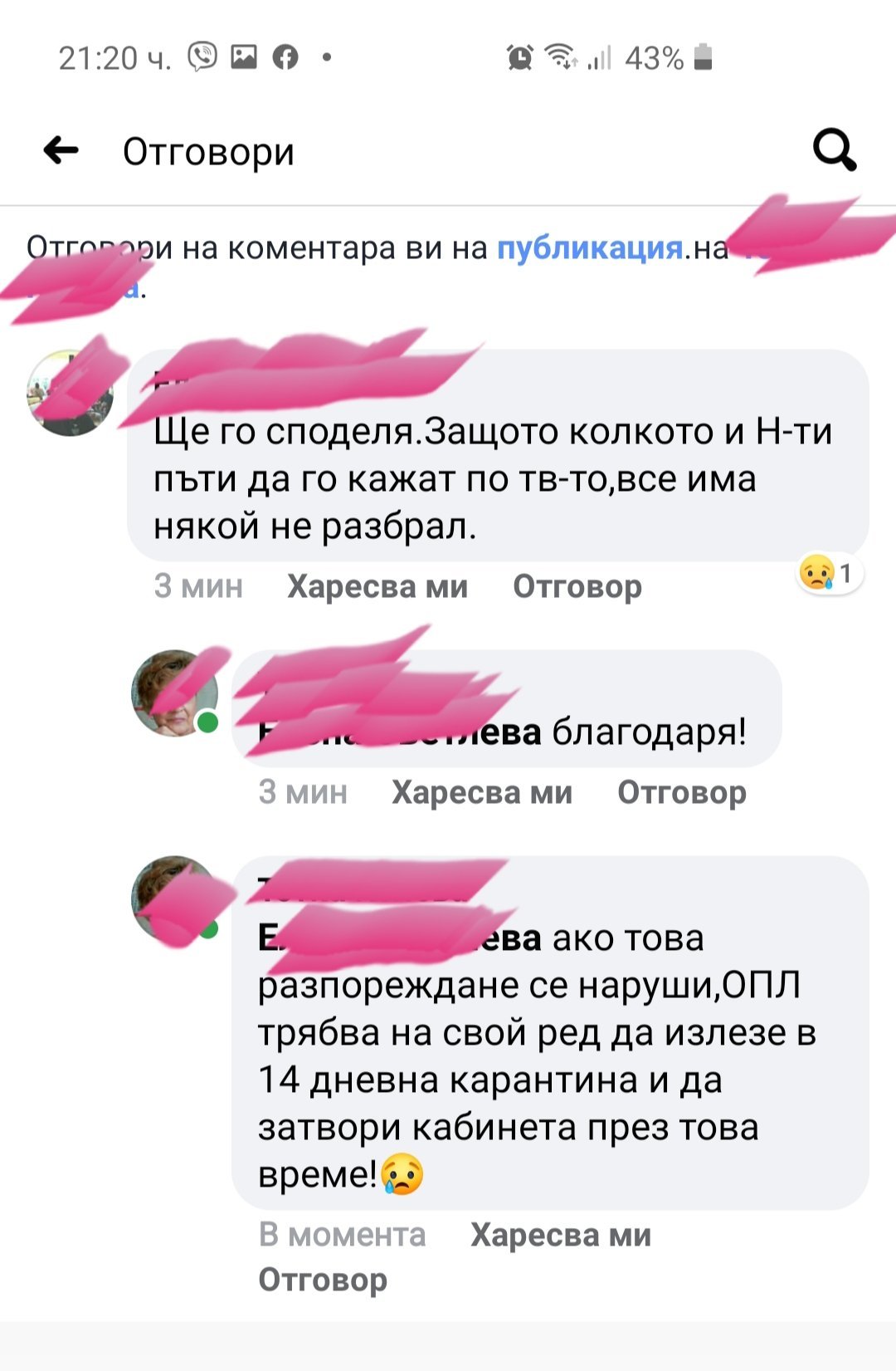 Току-що ми написа и това.Че ако някой я наруши ще трябва и тя да излиза 14дни в карантина.А в нашия град който е огромна община имаме много малки лични лекари на 50 000човека Sad