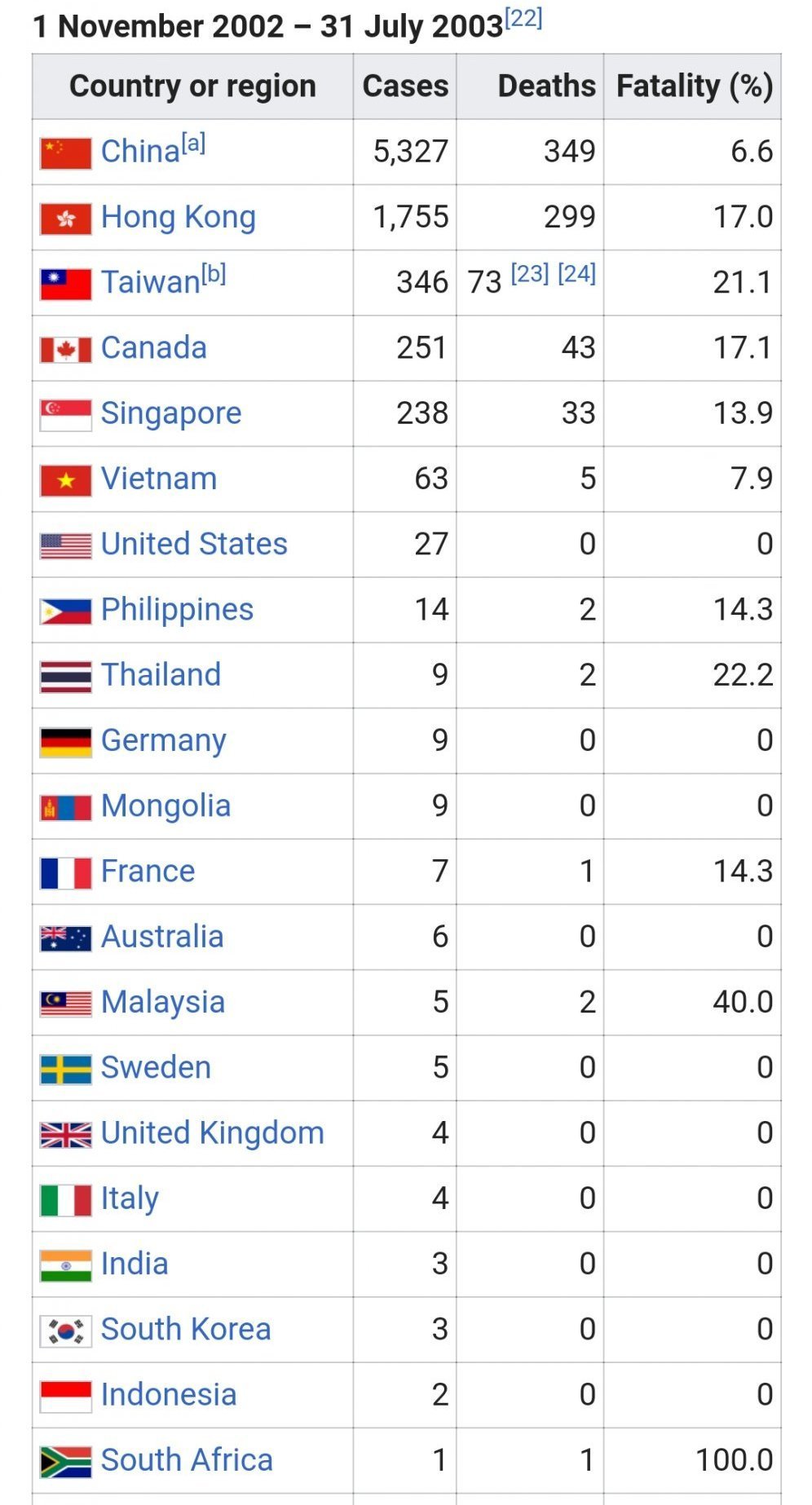 Вижте сходствата на епидемията на Сарс и тази на Коронавируса. Колко си приличат нещата, то не е случайно т,като говорим за едно и също семейство вируси. И като географско разположение (Отново всичко е главно над екватора, отново Южна Америка и Африка на практика ги няма че дори и като времево разположение на епидемията). И забележете по какво се различват, по тоя въпрос който аз искам да се зададе от някой журналист най после на СЗО. (Вижте смъртността). Тя е много по висока от тази на Короната, но пък вирусът много трудно се предава за разлика от Короната, и другата разлика (смъртността извън епицентъра Китай е много по висока, за разлика от обърнатата ситуация с Короната където в Китай смъртността е много по висока (със всичките условности които трябва да направим около меродавността на данните за Коронавируса). Някой от журналистите трябва най после да почне да пита за тия неща по пресконференциите на СЗО. На какво се дължи това да има различна смъртност в епицентъра и извън него, освен това аз например не знам защо и при САРС я има същата ситуация макар и обърната.