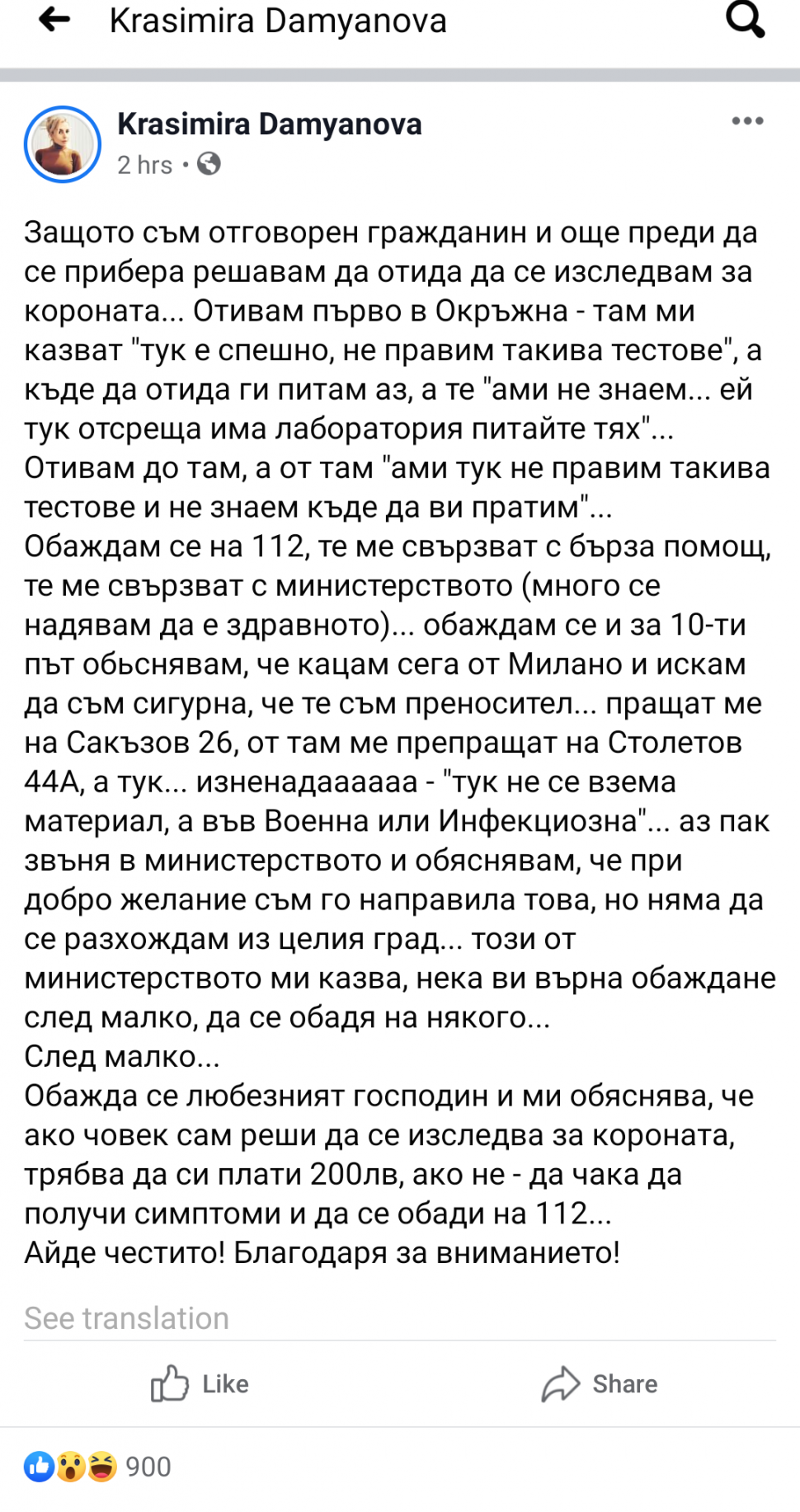 Хора,за да карат тази женица да си заплати теста от 200 лв това говори само за едно-нямат достатъчно бройки тестове!А ние  ще чакаме адекватни мерки!