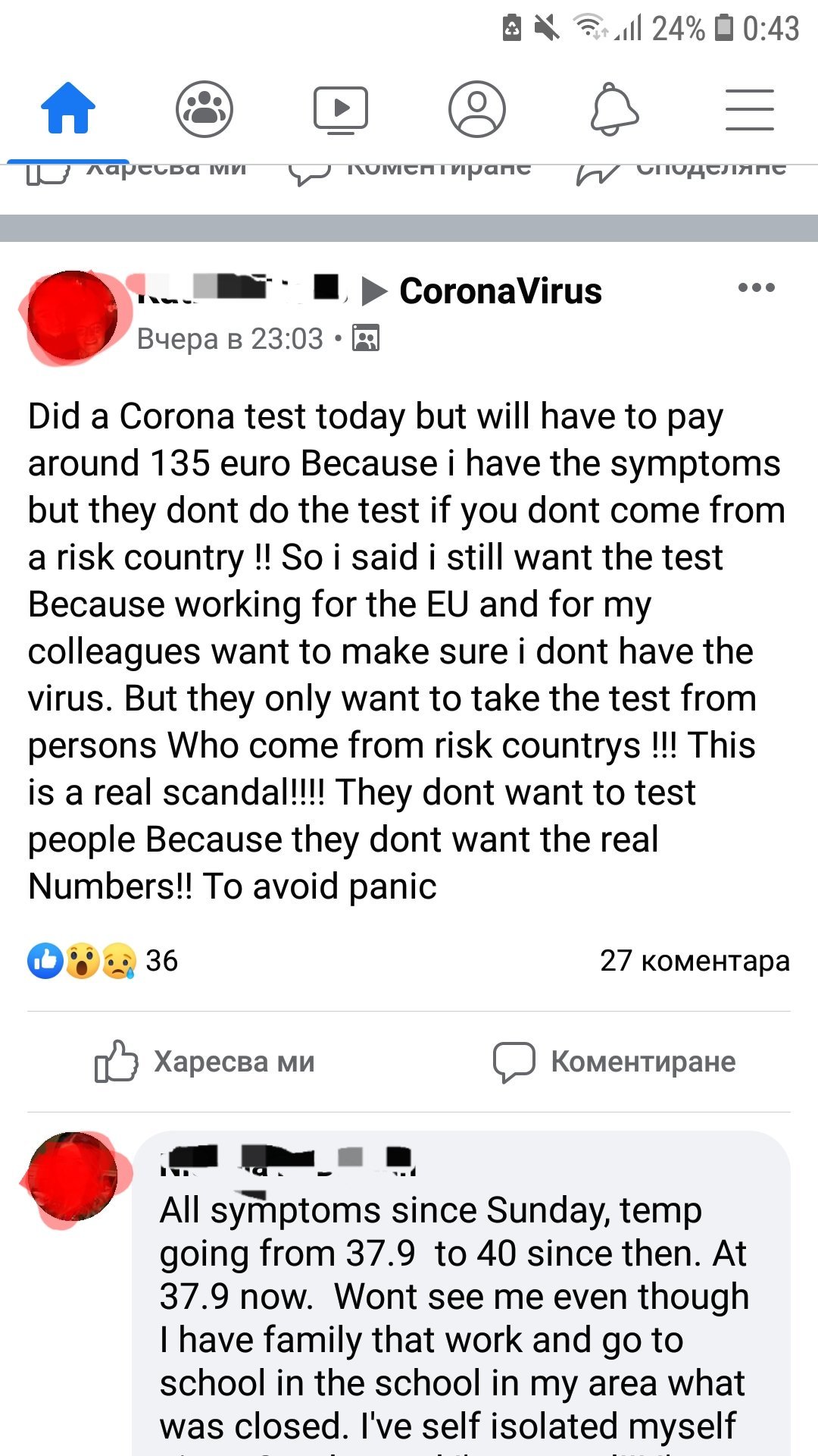 Току-що прочетох за Белгия, жена, която твърди, че има симптомите на covid, си е направила теста за ок. 135 евро, които ще трябва да плати, тъй като не се връщала от рискова страна.