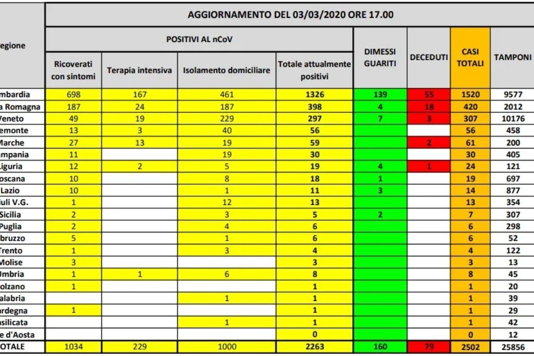 Прилагам таблица със случаите в Италия от вчера, 03.03.20 17ч. Ако ми попадне днешна таблица, ще обновя: