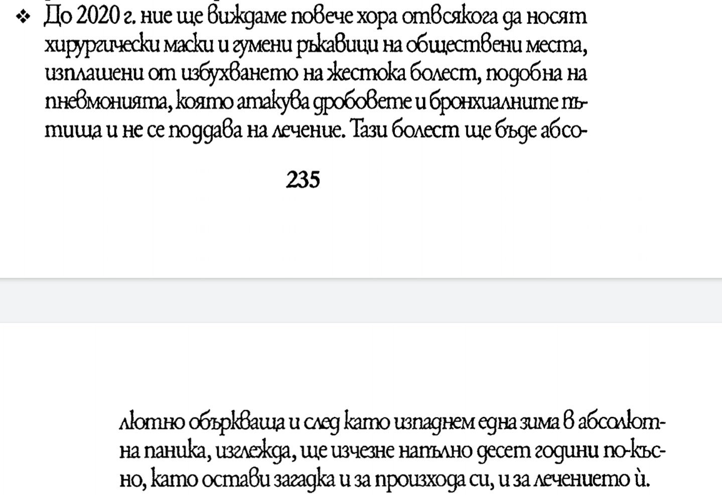 Скоро гледах един сериал - "От другата страна". Там ставаше въпрос за грип, който помита 3 % от населението. И дават как няма събирания на много хора, почти празни улици и т. н Това като последствие след 20 г.