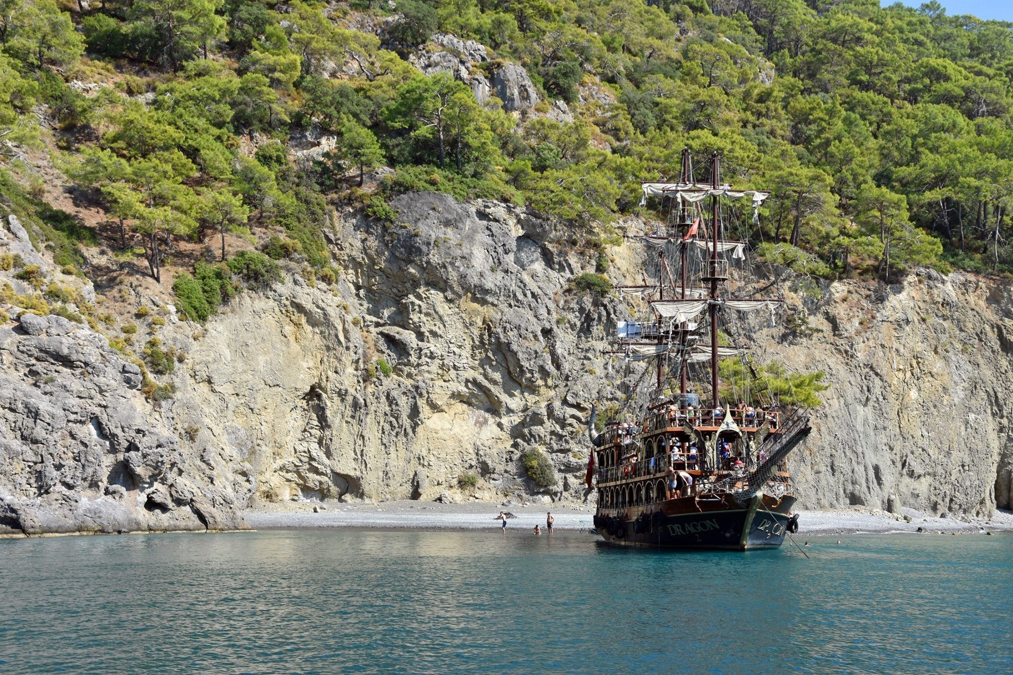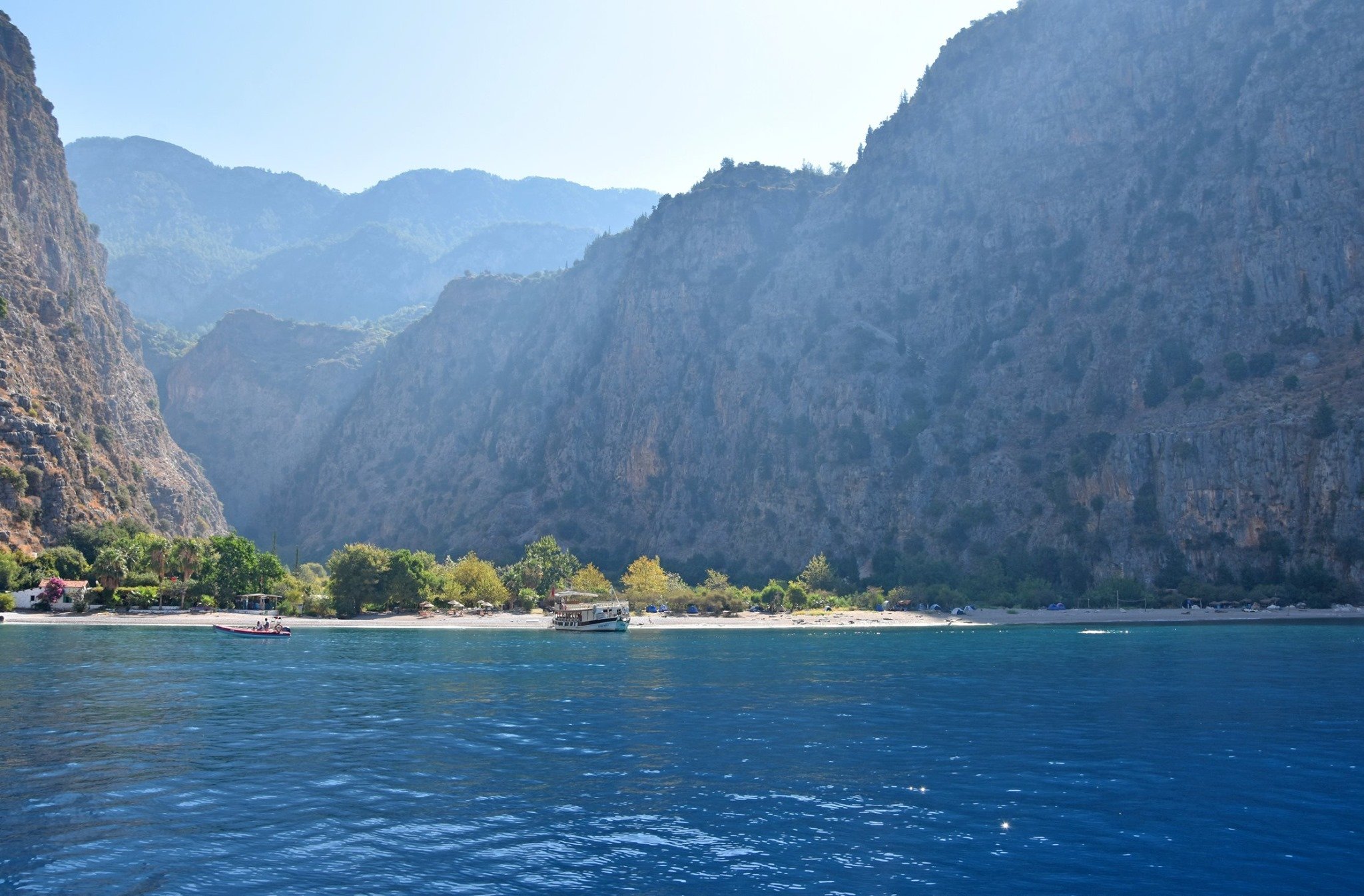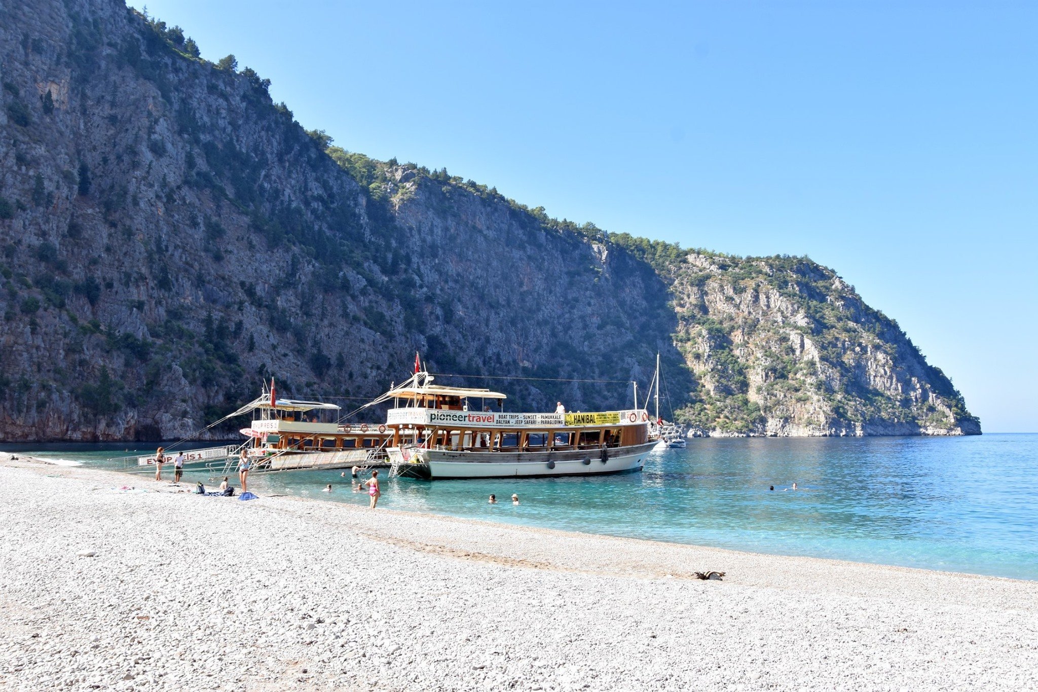 След ден лежачка на Синята лагуна се отправихме на обиколка „Шестте острова“. Има и 12, но за нея се тръгва от Фетие, а тук - от нашия градски плаж. Може да се купи билет на място от плажа, обикновено се тръгва в 10. По-голям кораб - повече хора и шанс за музика до дупка през целия път. Тук наближаваме един от топ 5 на най-красивите турски плажове - Butterfly valley, намира се съвсем близо до Олюдениз и на ден до там ходят по 3-4 корабчета от централния плаж.