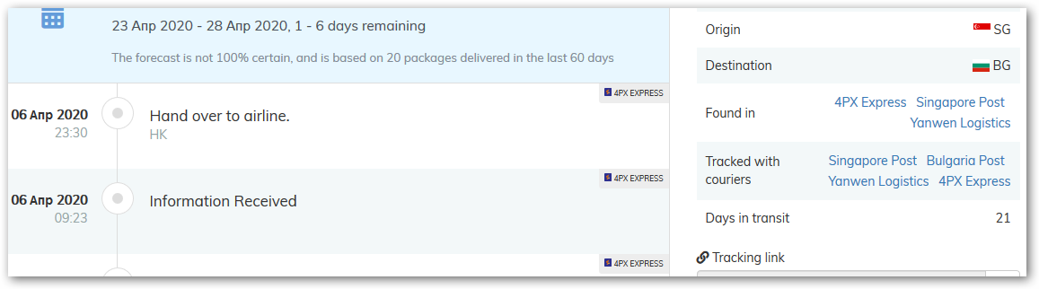 ако тракинг информацията изчезне от куриера, до преди 3 дена бе в Сингапур, сега такъв номер не съществува
