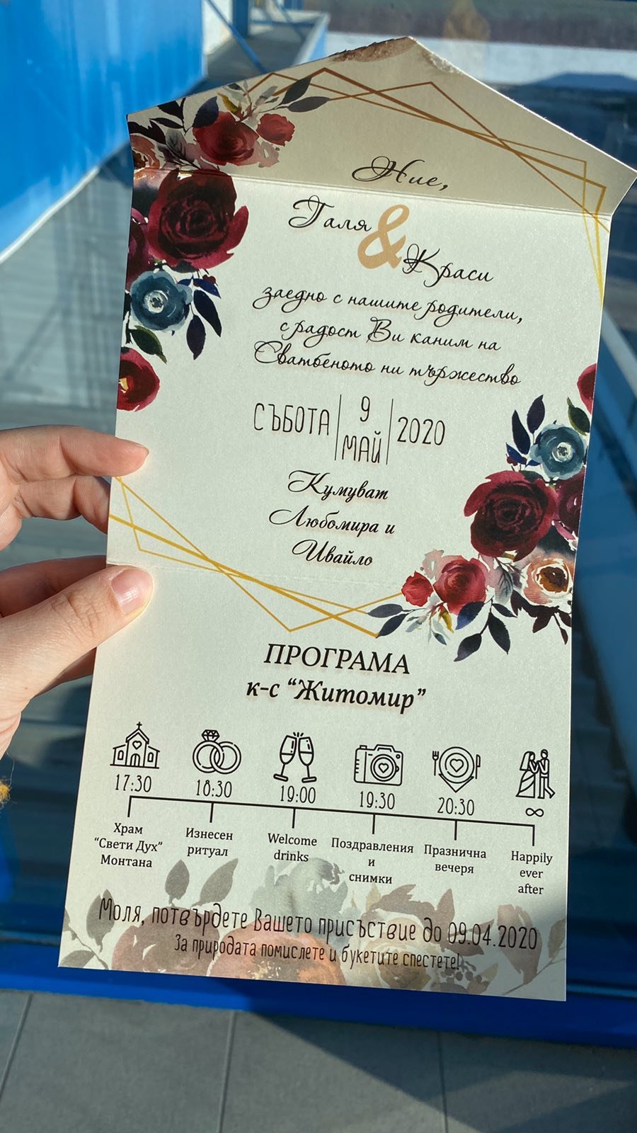 2. Поканите си ги правихме сами, дизайна е на Photoshop, използвахме печатница CMYK , излезе ни 1,30 за брой разпечатването на перлен картон, на обикновен щеше да е 0,82(при 250бр...), восъка е от Амазон, печата от My 3D world, лентата от Фантазе (страница във фейсбук). Ако някоя иска по-подробна информация, ми пишете да не ви досаждам сега. Самите покани ни излязоха около 2лв/брой.