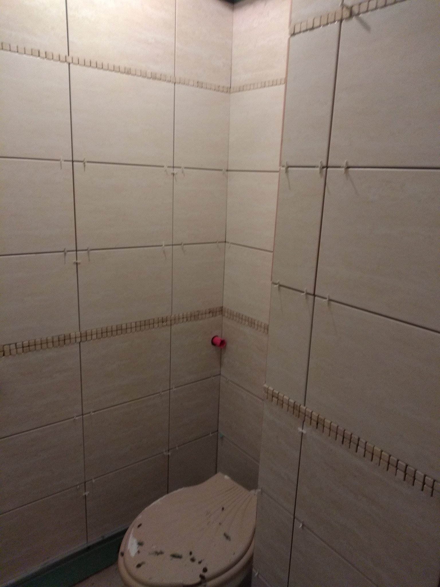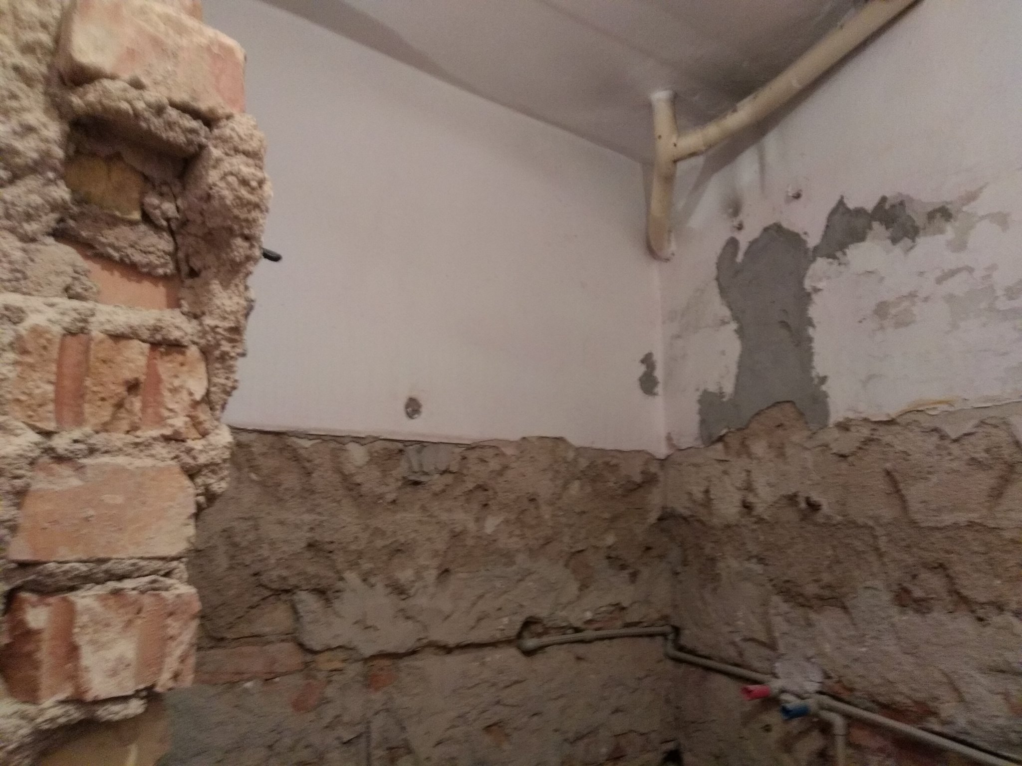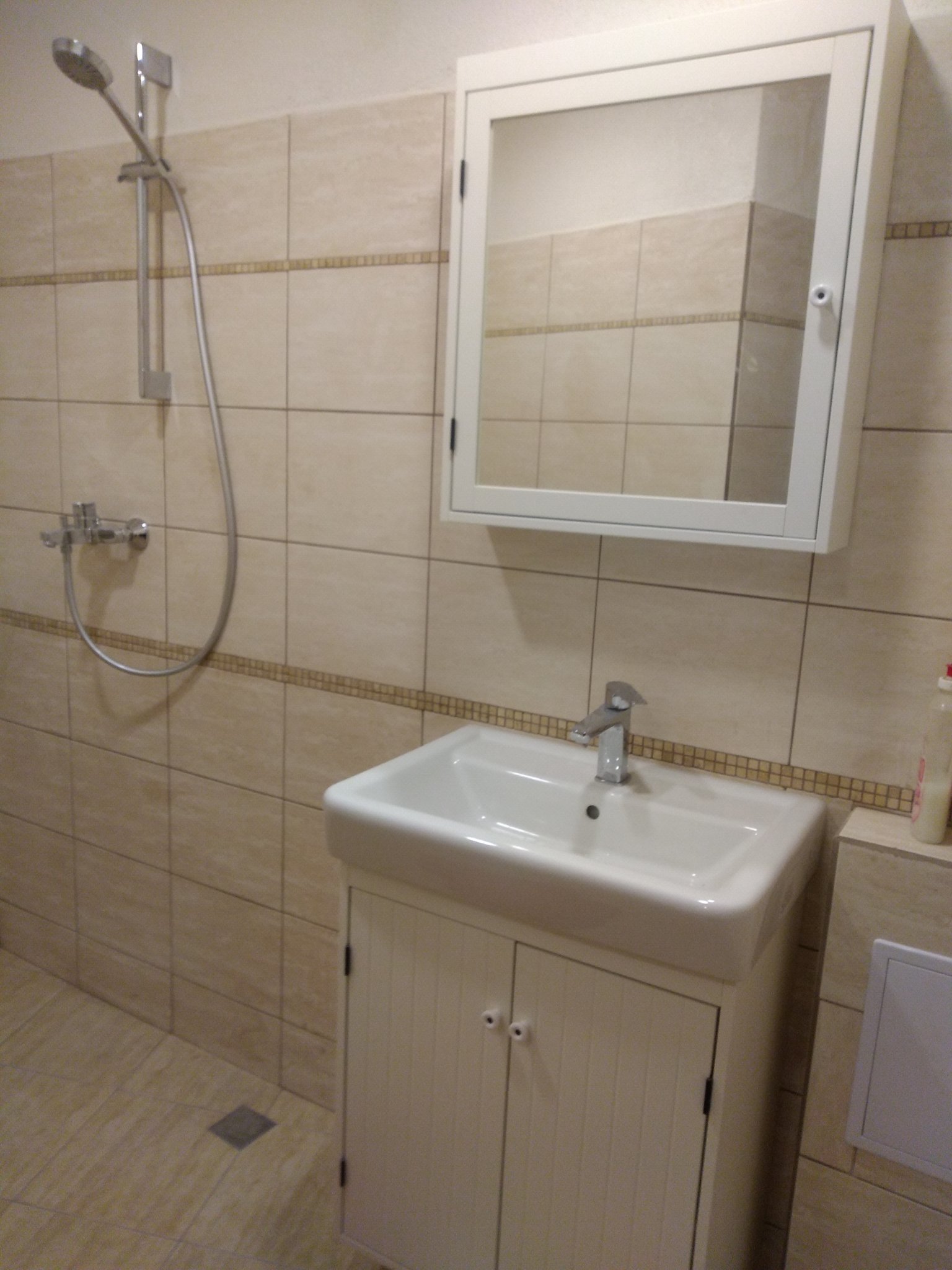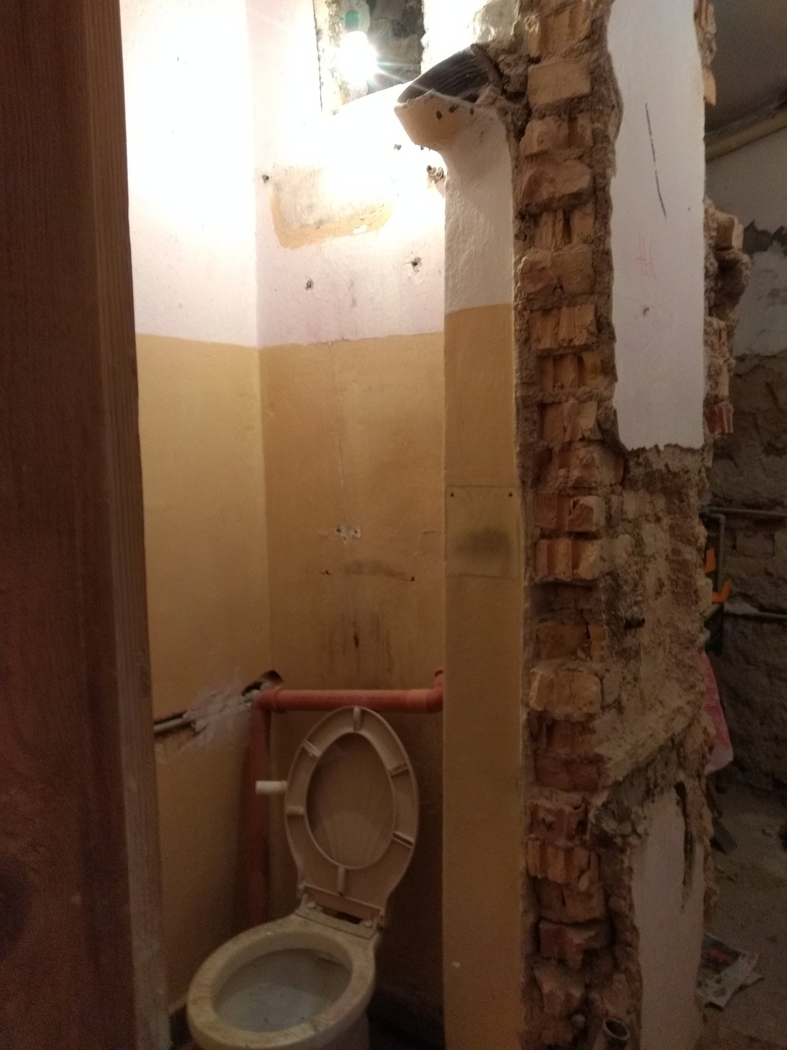 Ремонт на баня, не съвсем довършен. От три помещения - врата през която се влиза вкоридор, в него врата за изключително малка тоалетна и още една врата към баня, след изкъртване на касите се оформи едно помещение.