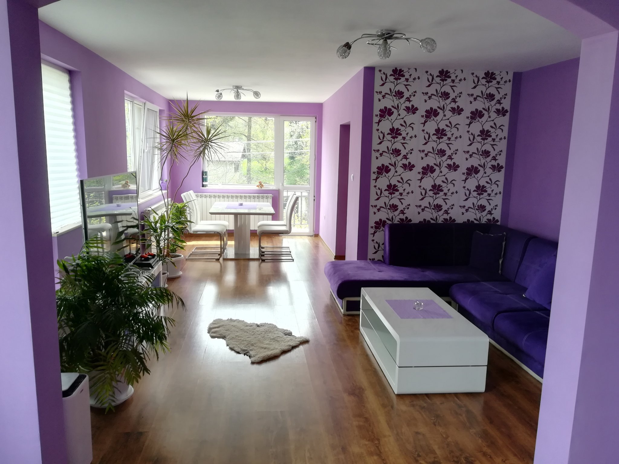 Много ми хареса лилавото и кухнята. Само трапезната маса не е ли доста далече от кухнята? Струва ми се, че е в другия край на стаята, след холната част