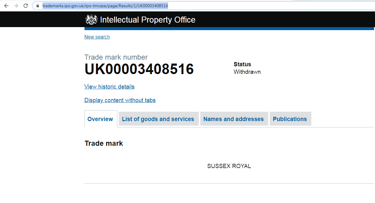 Статусът на марката Sussex Royal e Withdrawn (оттеглена):