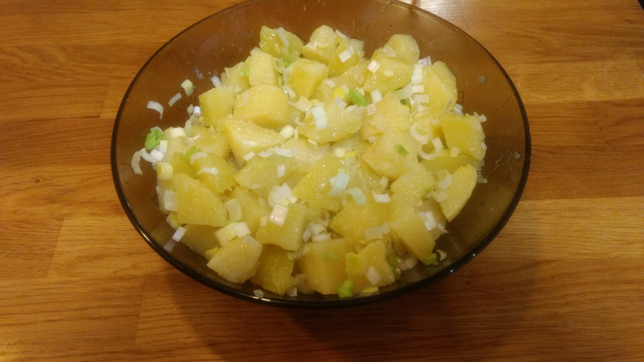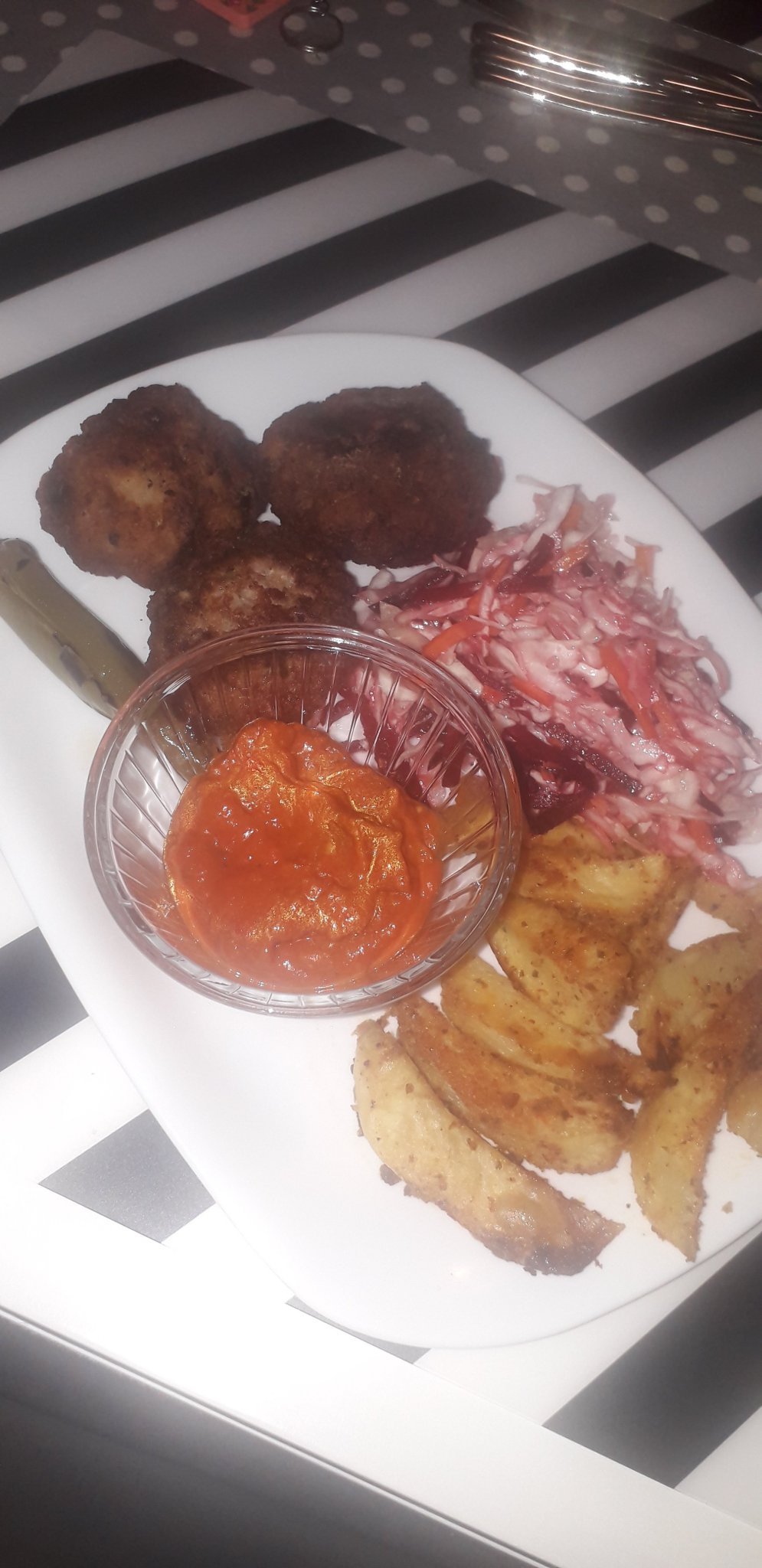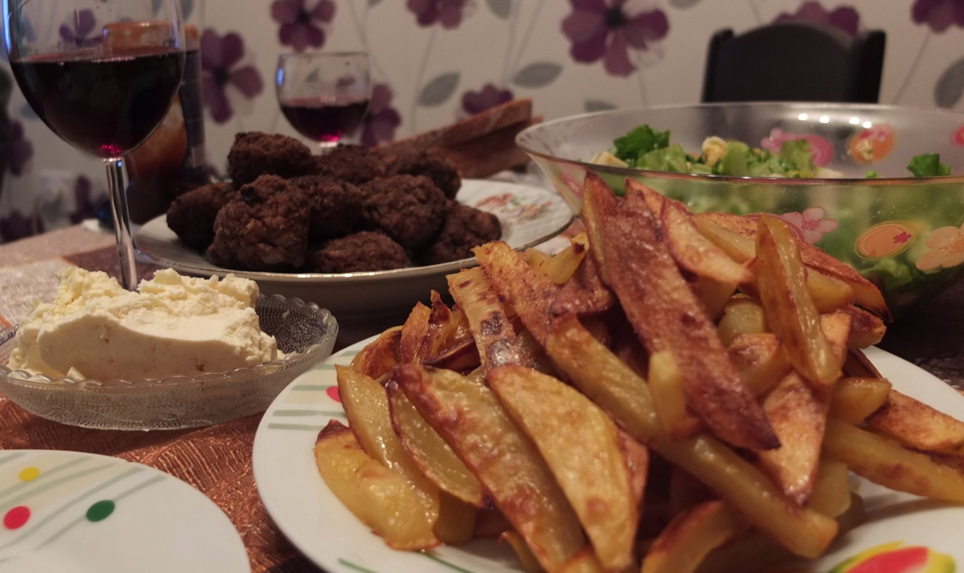 Снощната вечеря - пържени кюфтета, "пържени" картофи във фурната, домашно сирене и зелена салата