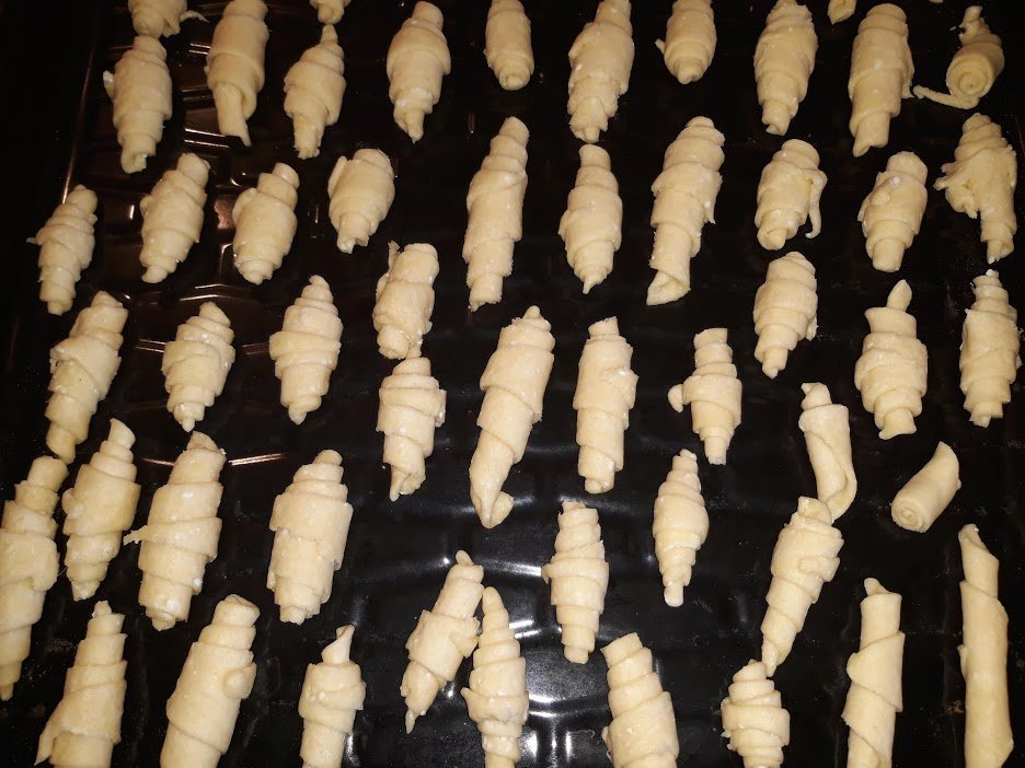 Замесва се меко, нелепнещо тесто. разделя се на топки.Всяка топка се разточва в кръг с дебелина около милиметър или малко повече.Разрязва се на 16 части и всяко парченце се навива отвън към центъра, на охлювче.Пекат се на 180-200 градуса, зависи от фурната, в предварително загрята фурна, малко по-ниско от средата, до златист загар.Тестото може да престоява в хладилник, може да се намажат отгоре с яйце, могат да се поръсят със сусам или мак или друго, по желание.Аз не мажа и не ръся с нищо.