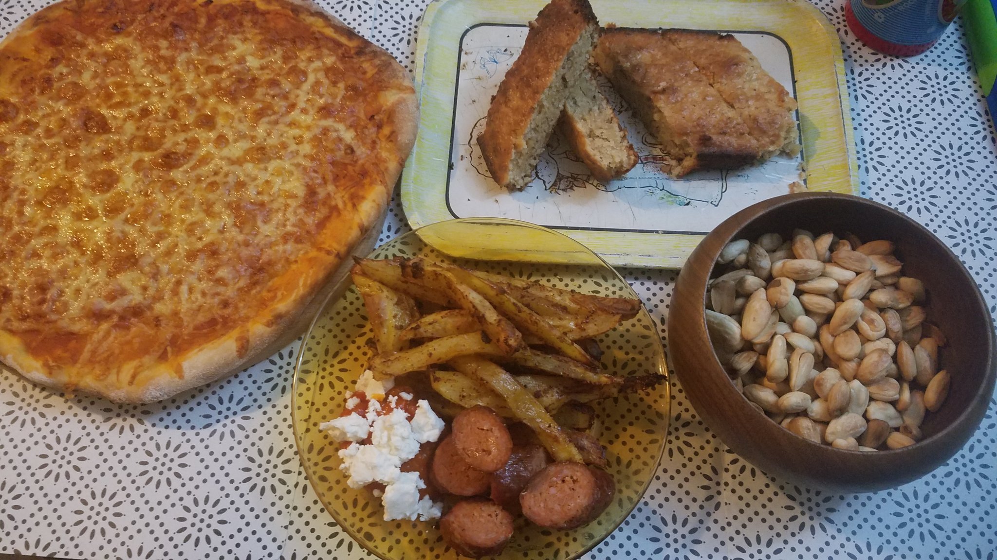 Здравейте! От скоро ми става все по-трудно да мисля какво да се хапва у дома. Днес разгледах темата и ми припомнихте,че отдавна не съм правила кекс Simple Smile Готвя всеки ден за вечеря и за обяд( който се приготвя в кутия за работа). Сега ще имам още един жокер като гледам какво сте готвили , за да ми е по-лесно . За днес направих кекс по рецепта от форума, пица за най-малкия( с домашно тесто), картофки с бабекова наденички и на загрятата фурна изпекох белени бадеми.