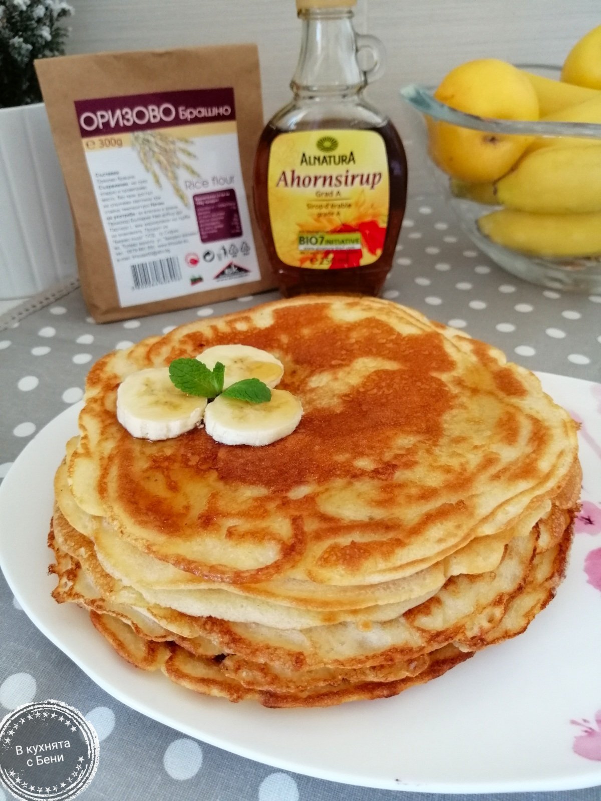 Здравейте, момичета! За закуска днес приготвих вкусни палачинки с оризово брашно и разбира се, без захар. Компания им правиха парченца банан и чуден кленов сироп. Прекрасен следобед! Simple Smile