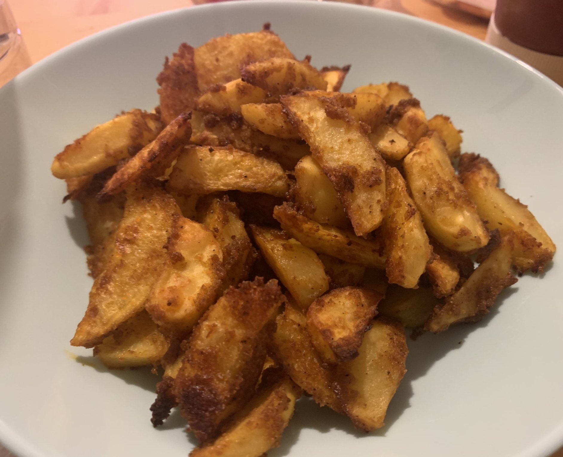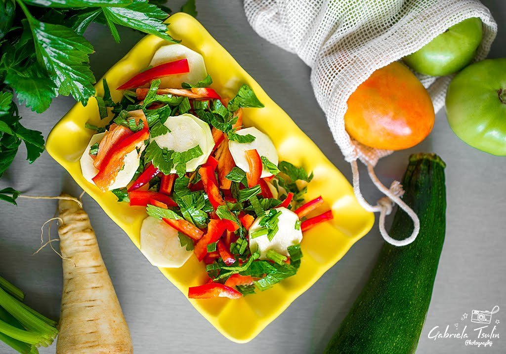 За да приготвите ястието, първо нарежете патладжана на филийки с дебелина около 0,5 см. След това го посолете и оставете да престои 30 минути, за да излезе горчивият вкус. Изплакнете и подсушете патладжана след това. Всяка филийка се овалва в брашно и се подрежда в тава без застъпване. Поръсете със сол, олио и печете във фурната. Междувременно чушките се пекат във фурната, след което се приготвя сос на котлона. Той се залива върху чушките и може да се добави индийско орехче по желание за по-богат вкус.