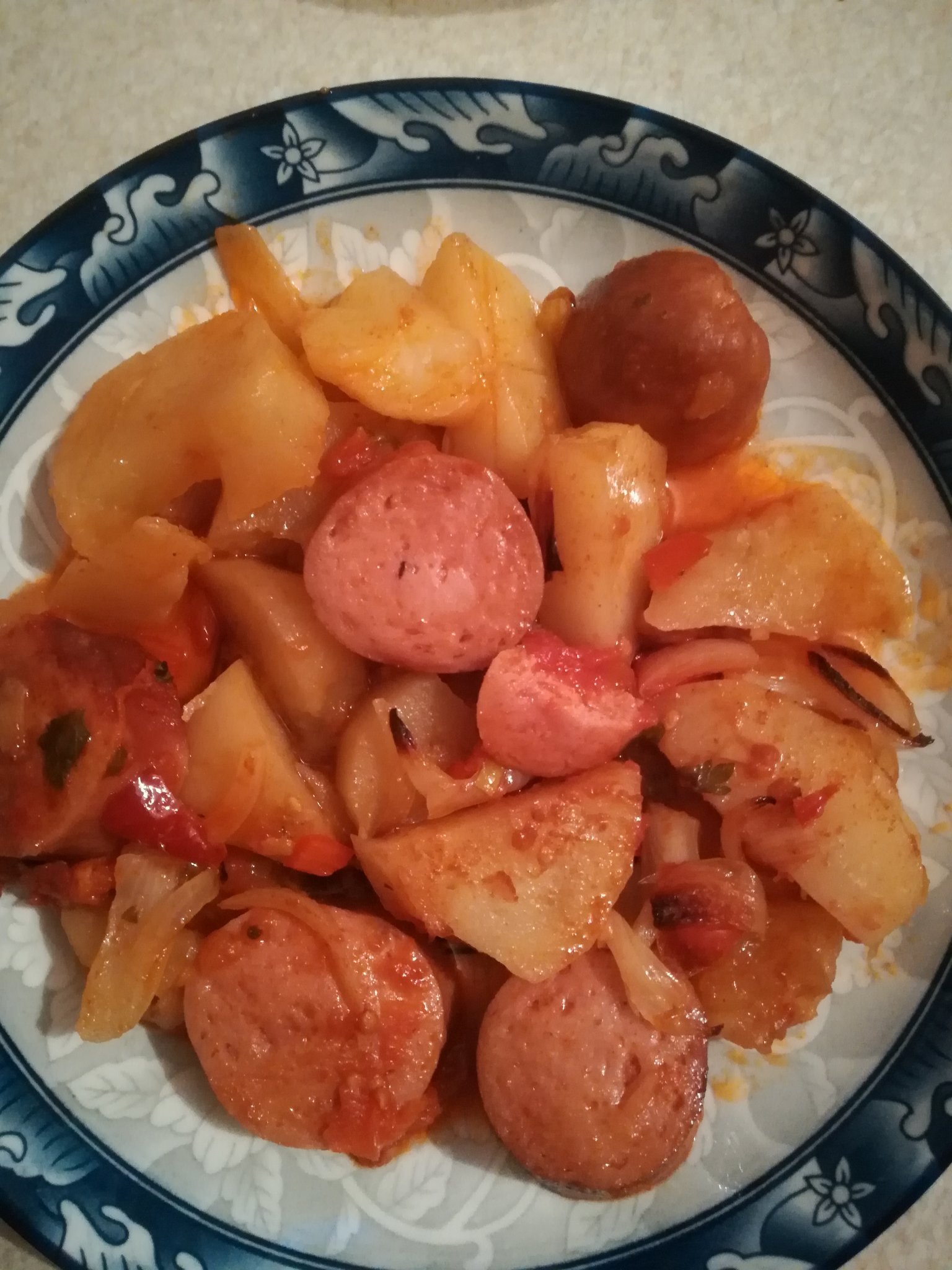 Вечерята снощи - варена наденица, лук, картофи...в йенската тенджера и във фурната.