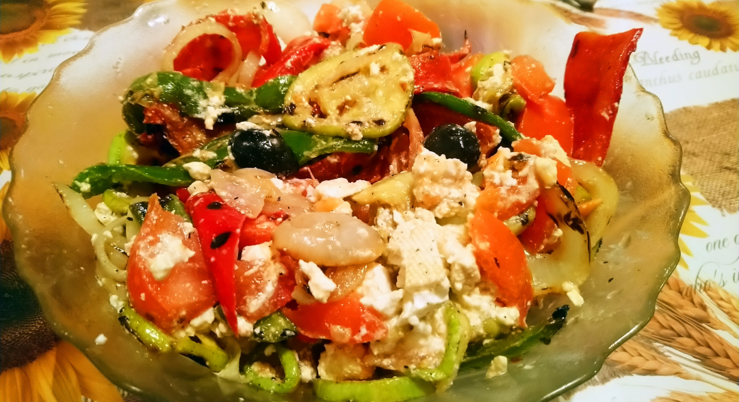 Салата с гриловани зеленчуци (тиквичка, лук, пипер), домати, маслини и сирене