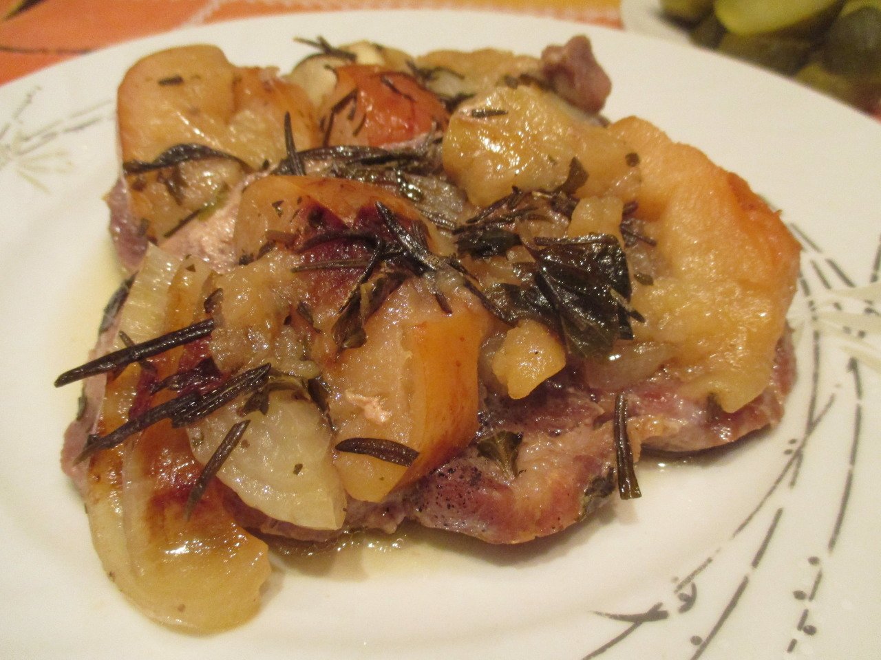 Свински вратни пържоли с лук, ябълки, мента и розмарин