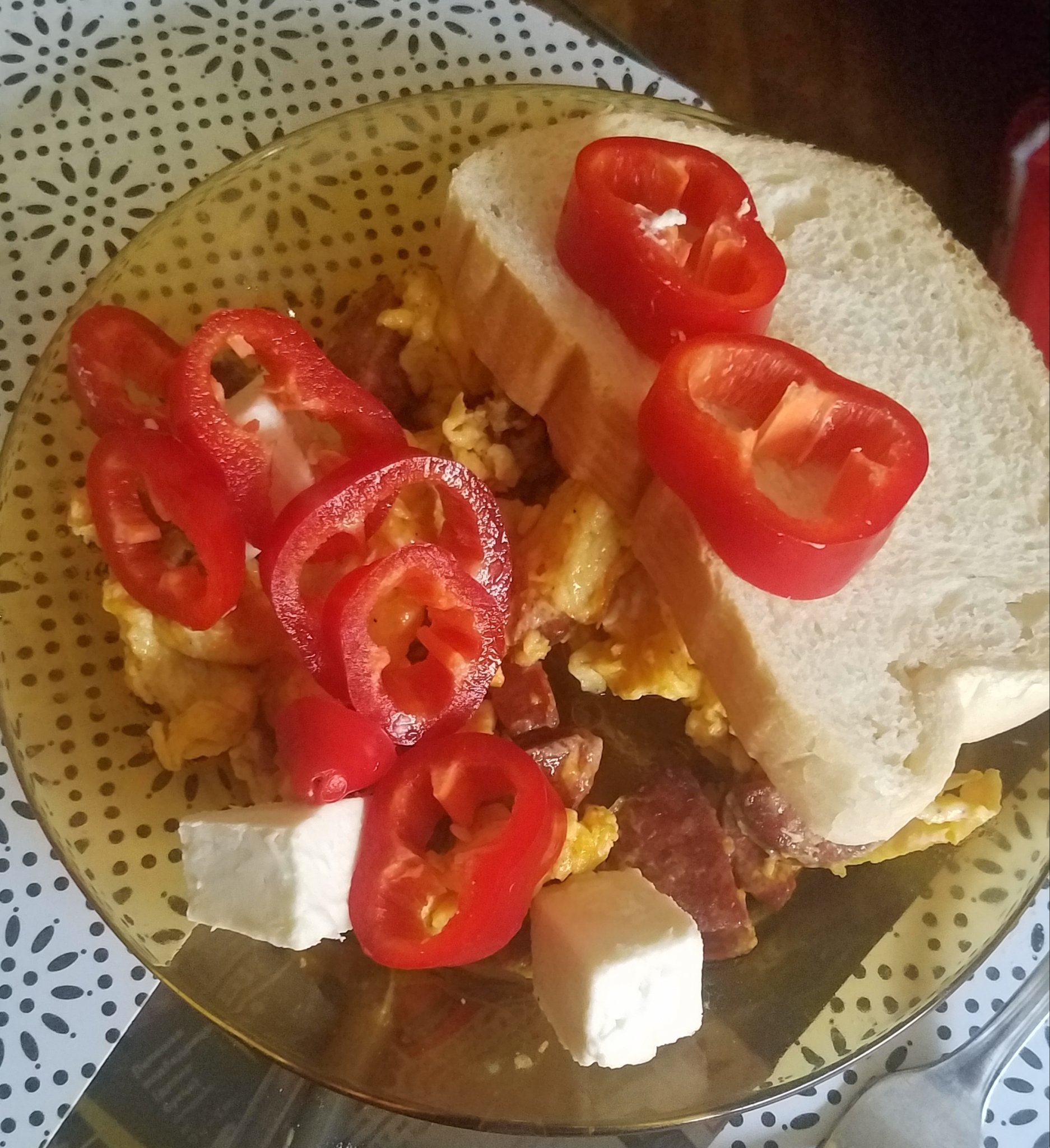 Днес обядът се сготви(с малко помощ от мен), аранжира и сервира от моя син,който скоро ще стане на 4. Бъркани яйца с бабекова наденица: