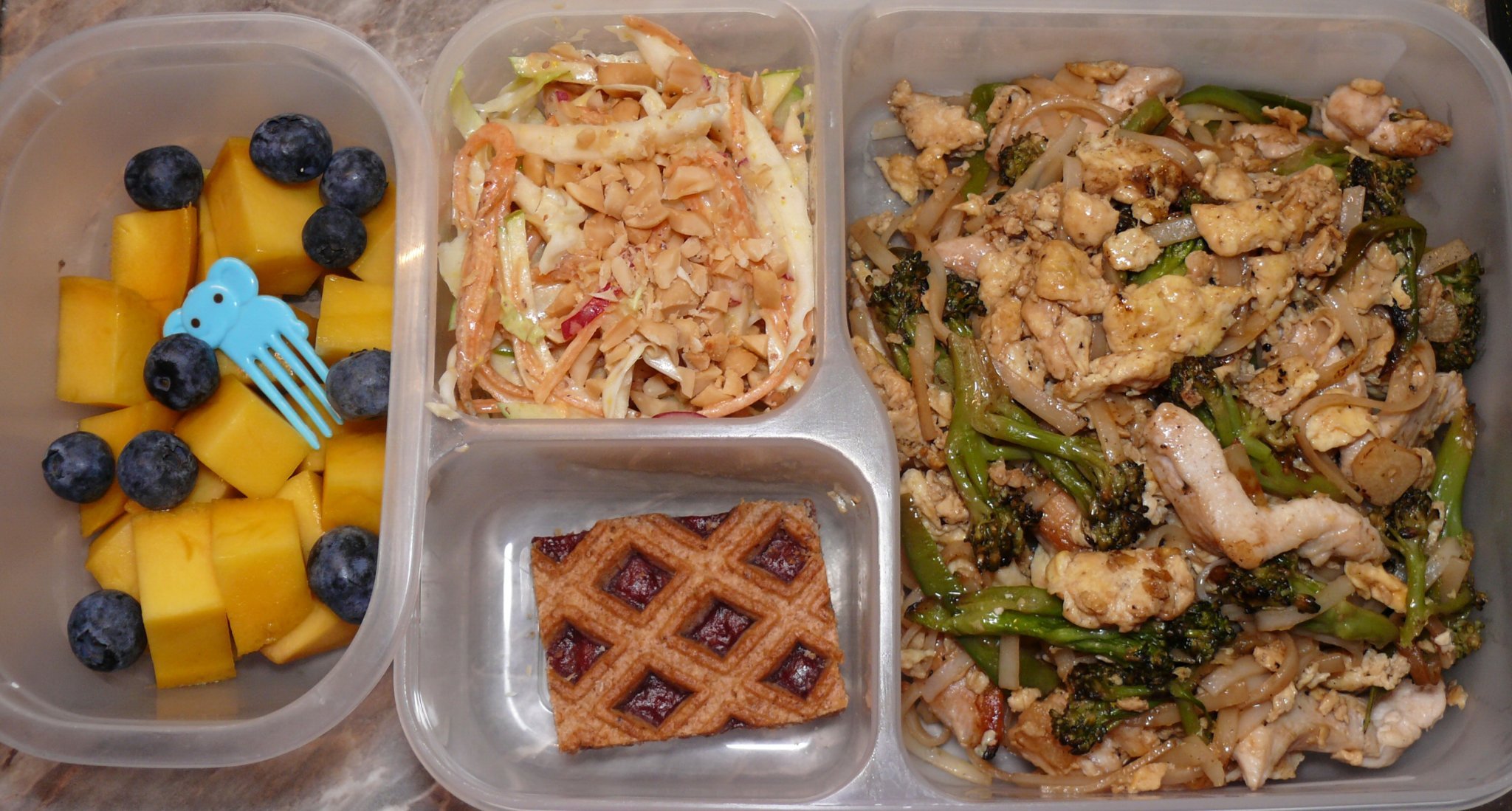 Днес моето момиче ще хапва едно от най-любимите си ястия - Оризови нудли с пилешко, яйца, броколи и млад грах;   салата - кит. зеле, морков, репичка и ябълка с горчичено-майонезен дресинг;  лимецов линцер с френско грозде; манго и боровинки