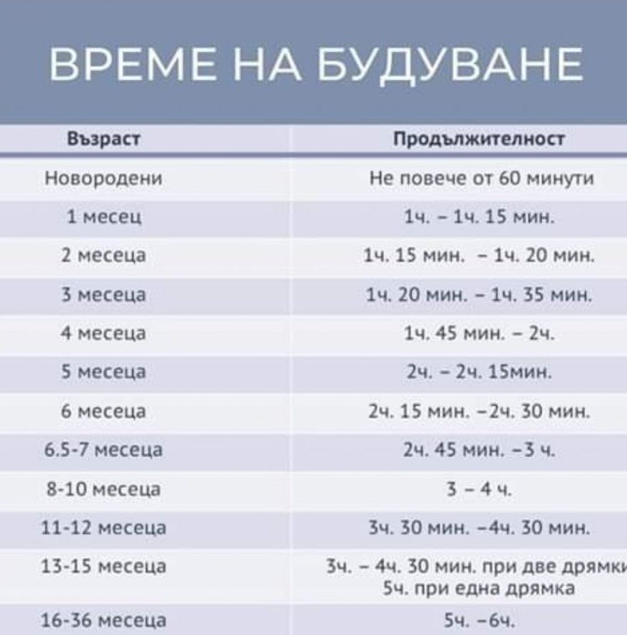 Привет, имайте предвид, че като порастват се удължава времето за будуване. Аз спазвам схемата и съм много довошна 😊