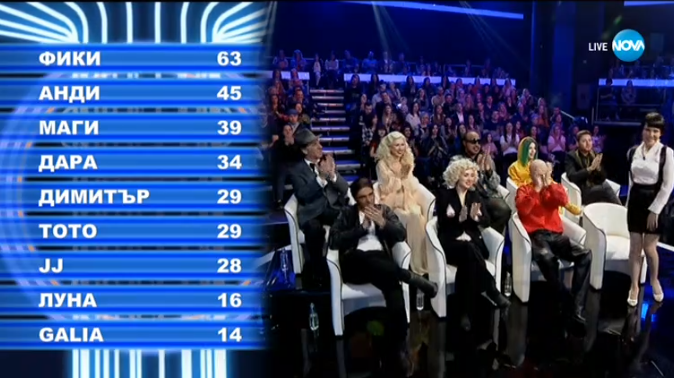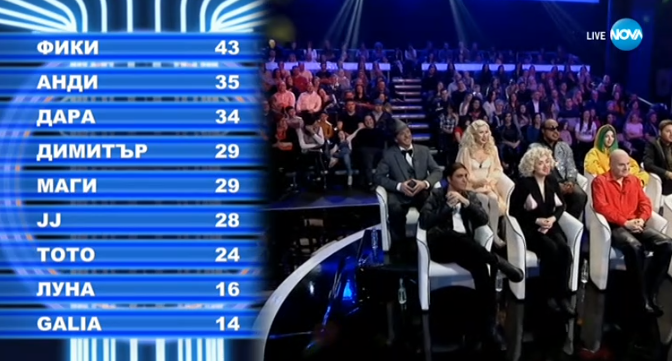 Галя - 3, Луна - 4, Дара - 5, Маги - 6, Тото - 7, Д. Маринов - 8, Георги - 9, Антоан - 10, Фики - 11