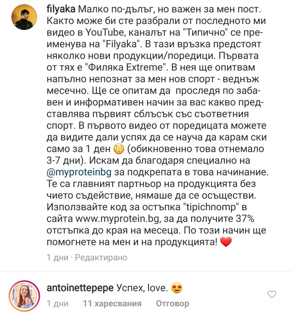 Извинявам се, че ще ви прекъсна дискусията за Любо, но случайно попаднах на едно стори на Филип 3-ти- бивш колега от Типично е страйкнал няколко видеа, поради липса на авторски права на Филип, и има възможност да изтрият канала на Типично на 03.03, ако не се изяснят авторските права. Според мен е тъпо да "прецакваш" приятел и да се опитваш да му изтриеш канала след като сам си решил да напуснеш. От друга страна пък Филип ще взема пак парата, въпреки че абонатите са се събскрайбнали за друг вид съдържание.