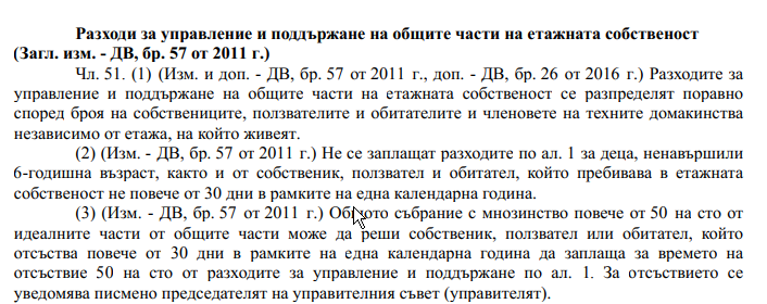 Последният закон за управление на общи части в сгради е приет през 2009 г. с последващи изменения, направени през 2011, 2016 и 2018 г. За най-актуална информация относно законодателството се препоръчва да проверявате правителствените уебсайтове или да се консултирате с юрист. Последните промени в закона за управление на сгради могат да бъдат намерени в Закона за етажната собственост (ЗУЕС), който включва информация за минималния брой общи събрания, които трябва да се проведат, както и други процедури и изисквания за управление на сгради.