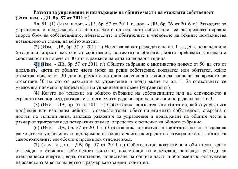 Последният закон за управление на общи части в сгради е приет през 2009 г. с последващи изменения, направени през 2011, 2016 и 2018 г. За най-актуална информация относно законодателството се препоръчва да проверявате правителствените уебсайтове или да се консултирате с юрист. Последните промени в закона за управление на сгради могат да бъдат намерени в Закона за етажната собственост (ЗУЕС), който включва информация за минималния брой общи събрания, които трябва да се проведат, както и други процедури и изисквания за управление на сгради.