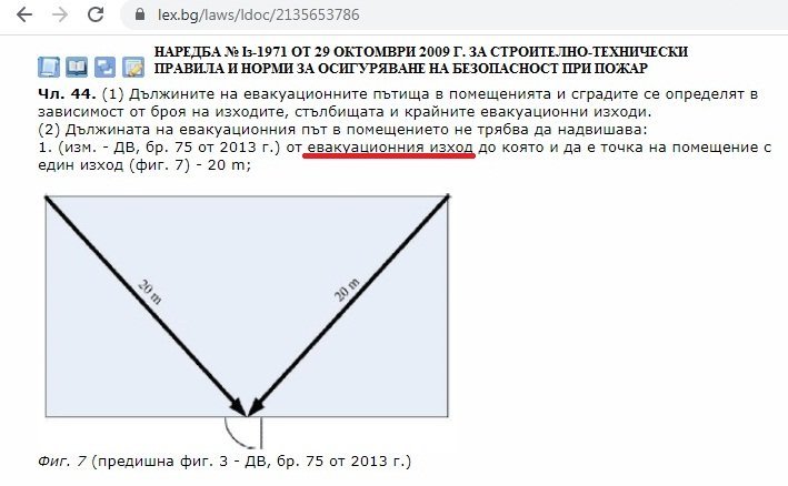 Обаче, такова местене е в противоречие с НАРЕДБА № Iз-1971 ОТ 29 ОКТОМВРИ 2009 Г. ЗА СТРОИТЕЛНО-ТЕХНИЧЕСКИ ПРАВИЛА И НОРМИ ЗА ОСИГУРЯВАНЕ НА БЕЗОПАСНОСТ ПРИ ПОЖАР, чл.44, понеже наличната врата се явява евакуационен изход, като към момента евакуационния път е 17,50 м., а с преместването ще стане около 30,50 м.