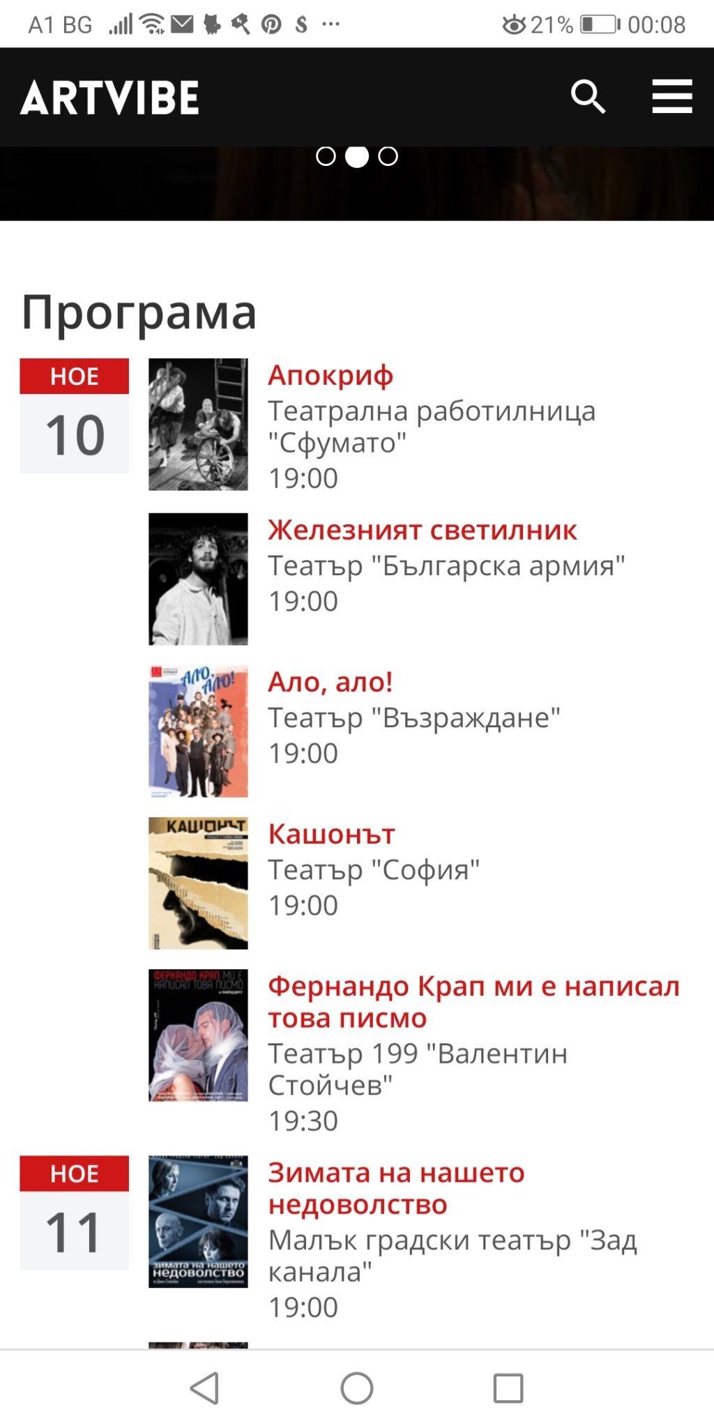 Обожавам да ходя на театър - това ми храната за душата. Дано не затварят театрите. В началото на пандемията нали пуснаха по фейсбук заснети постановки играни без публика. Ами не е същото.