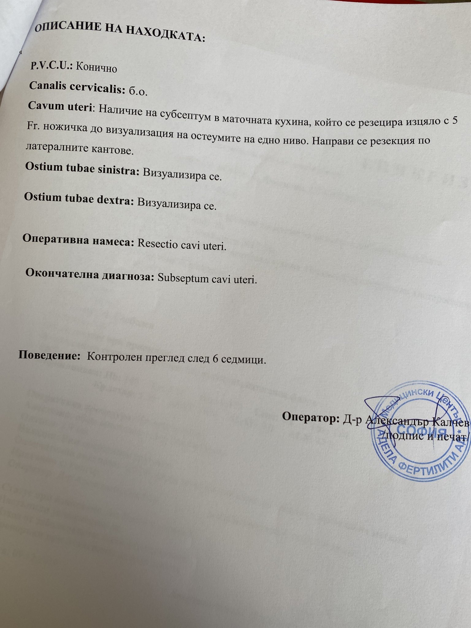 Та сигурно ще насмятам грешно . При нас е малко странно защото първия път заьременях аж след 1.5 години . Втория и третия бързо но два пъти имам тризономии . И малко неизяснена спермограма . А и ми предлага защото да има смисл тая хистероспокия щото ако чакам пак 1 година можело пак да се деформира . Какво що не знам той сам ми каза че колкото по скоро толкова по добре