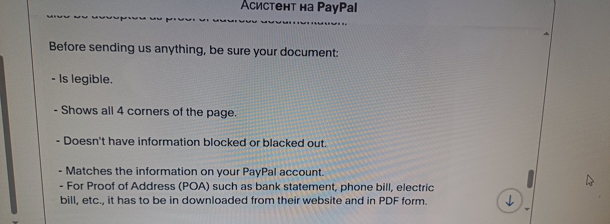 Здравейте! Кажете как да отблокирам акаунта си в Пей Пал ?Поиска ми потвърждение на самоличността ,но като качих лична карта ми писаха ,че не е издадена в последните 12 месеца. Какво да направя като всички документи (лична карта,шофьорска книжка и паспорт) са по-стари? Пробвах със служебна бележка от банката-първо не се четяло,втория път като пробвах да кача нямало лого или колонтитул. Нямам фактури от сметки на мое име ,защото са на името на мъжа ми.