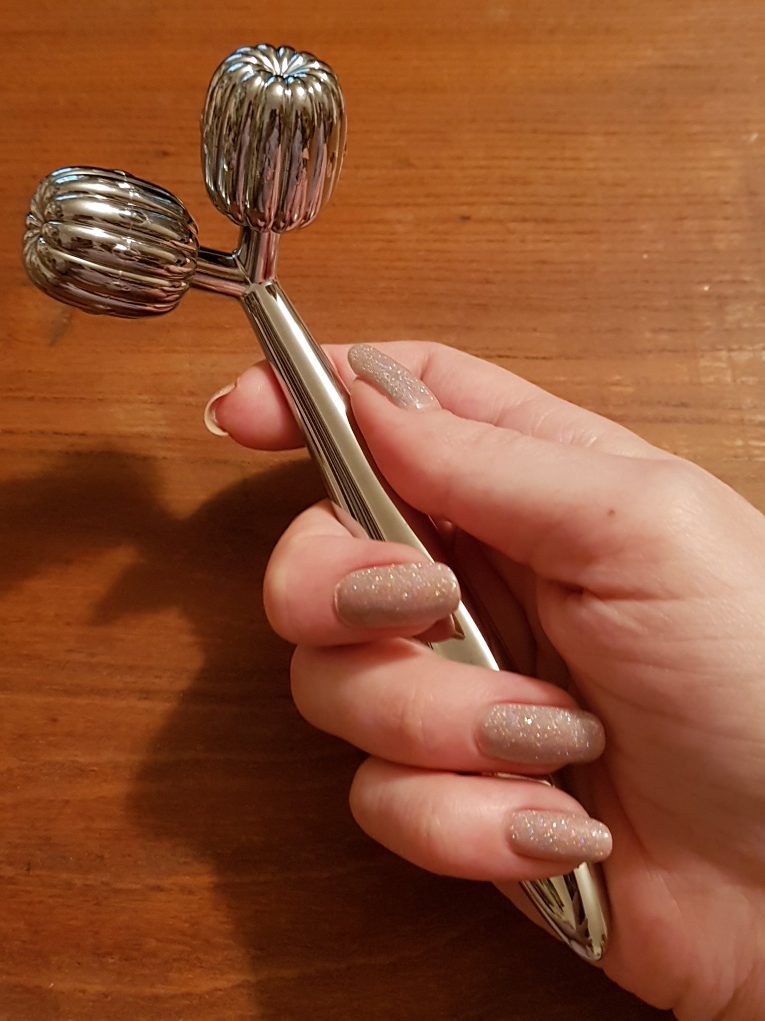И мойто ролерче е тука вече, екстра е за подарък, в хубава кутия е, има и някакъв спешъл сертификат вътре, има и като велурена торбичка за съхранение. Дръжката е тежка и метална, въртящите се топчета мяза на пластмаса. Потърлкалях си го по ръката, приятно е. Още не съм го пробвала истински. Ей ти малко превю, докато стигнеш да си разопаковаш твоя: