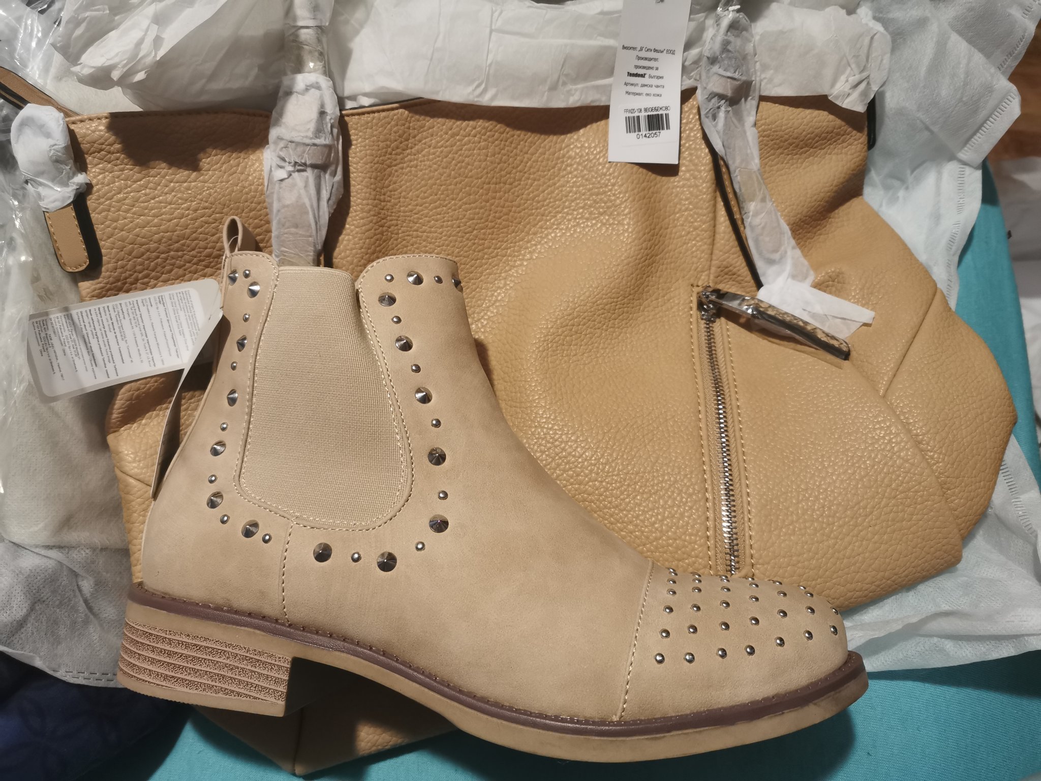 Пристигна чантата на Tendenz, много е хубава за парите си! Качеството на изработка е отлично, а аз съм придирчива колкото и ще да струва нещото. Голяма и удобна изглежда. Двете дръжки също са много удобни за носене и са точно толкова дълги и така разположени, че да стоят най-удачно. Кожата е мека и е от този тип, който много прилича на естествена. Също така този тип изкуствена кожа е здрава на износване при дълга експлоатация. Не е съвсем същия цвят като ботите, но не стоят зле заедно. Много съм доволна!