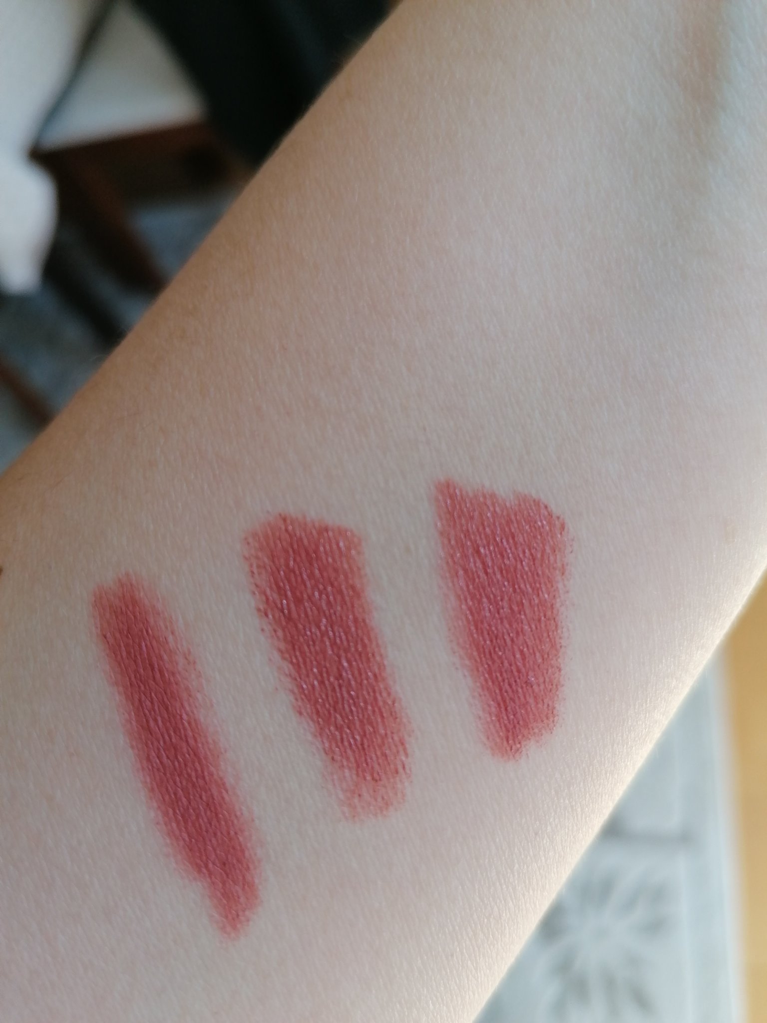 Взех вчера на L'oreal червилото  No hesitation. Мислех, че е нов цвят, но открих, че е идентичен с отдавна прадлаган на пазара цвят на свързаната марка Мейбълин и същият цвят имам и от Викон. Иначе си е хубаво червило, но по същество предлагат съществуващ цвят от поргфолиото им като нов зо L'oreal. Eто ги цветовете на ръката ми, лореал е най-отляво