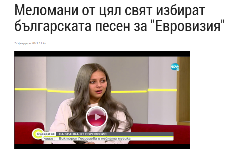 Песента за Евровизия ще бъде обявена на 10.03. По БНТ 1 (доколкото разбрах)- ще има концерт на който Виктория ще изпълни песните си и накрая ще обявят коя е избраната песен (вече са решили коя ще е). Концертът ще бъде предаван и чрез ютюб профила на Виктория, както и на страницата на Icard. Нямам търпение...