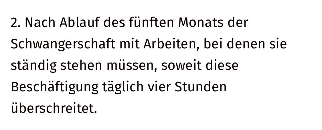 В закона пише при кои случаи работодателят трябва да ти осигури друго работно място, напр работа на конвейр, на норма и т.н Ако не може да ти осигури друго място, тогава влиза в сила Beschäftigungsverbot.