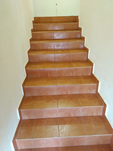 Това е стълбището което в момента боядисваме в капучино и шоколадов мус. Плочките които са не ми харесват, но нямаме възможност да ги заменим и ми хрумна идеята да сложим  отгоре мокет. Според Вас какъв цвят би стоял добре и би допълнил цялостната картинка? Первазите ще ги боядисам с боя за плочки.- Благодаря предварително.