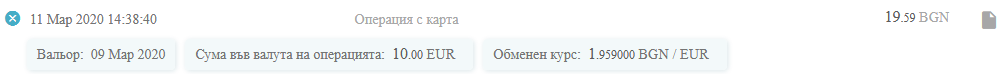 От онлайн банкирането на Банка ДСК. Показано е на какъв курс ми е превалутирала банката 10 евро. Платил съм с карта Visa.