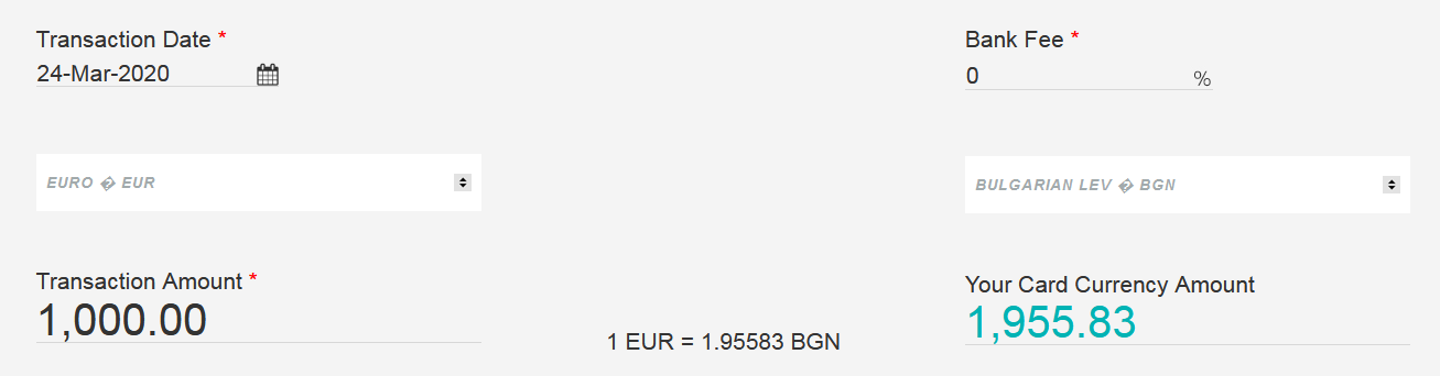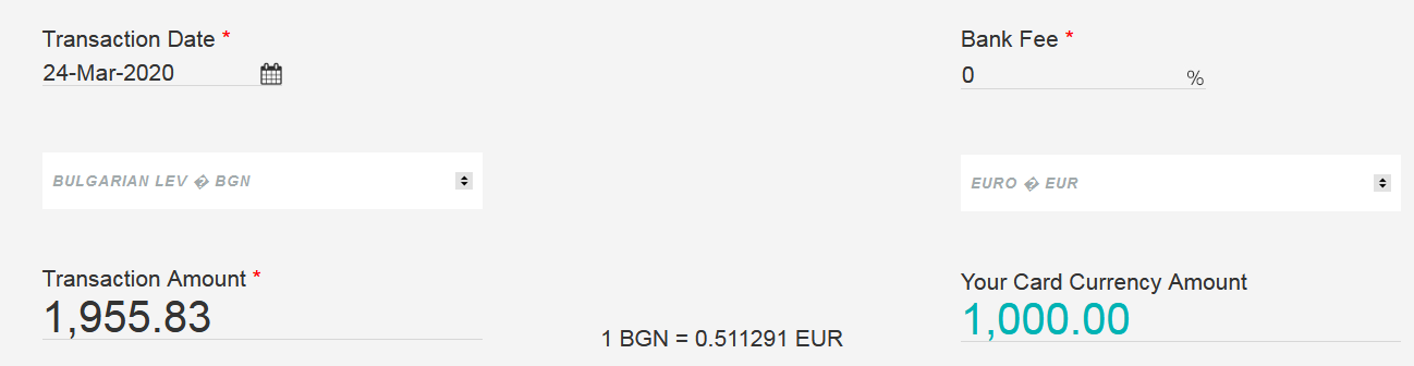 Пропускаш една подробност, която всъщност е от особено значение. Има поле "Bank fee", а няма българска банка, която да превалутира без такса калкулирана като краен курс продава/купува. Валутните курсове на банката се гледат, иначе еврото трябва банките да го превалутират по 1.95583лв., тоест по фиксинга на БНБ, а не е така. Виж "Скрит текст":