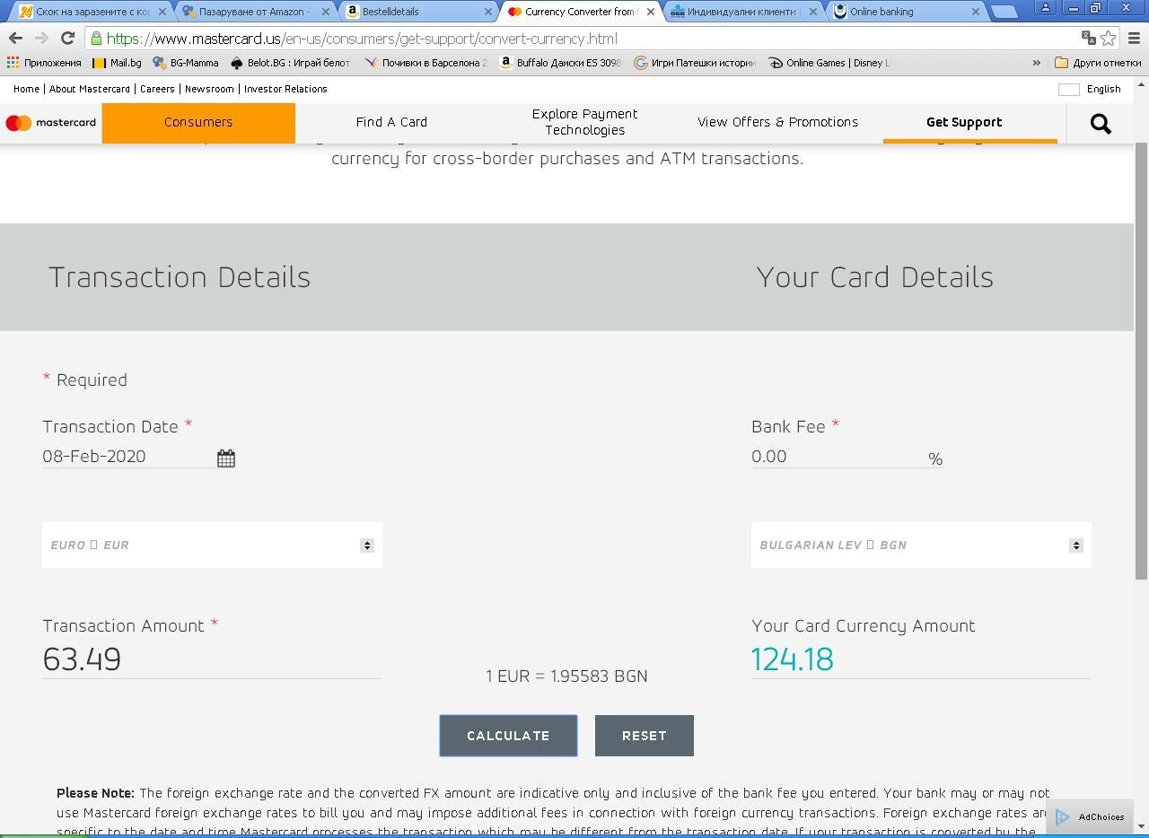 https://www.mastercard.us/en-us/consumers/get-support/convert-cu … rency.html   и https://www.visa.co.uk/support/consumer/travel-support/exchange- … e-calculator.html. Ако банката ви не начислява допълнителни такси (както е при мен -ОББ), то можете да си видите точната сума чрез тези калкулатори. Сложете ги и на първа страница в темата, защото явно все още има много заблудени хора.
