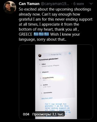 " Вече съм толкова развълнуван от предстоящите снимки. Не мога напълно да изразя колко благодарен  винаги съм бил за тази безкрайна подкрепа. Оценявам го от все сърце, благодаря на всички ГЪРЦИ. Иска ми се да знаех вашия език, извинявайте за това ..."