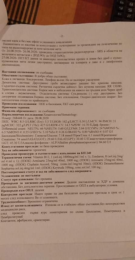Питай за препоръка за добавки за неутрофилите и тромбоцитите,заради пеметрекседа,както и витамини за невропатията от платината.От лъчето рецепта за кортикостероиди и антиконвулсант някакъв изписаха ли ви след радиохирургията.Може да има мозъчен отток след нея.