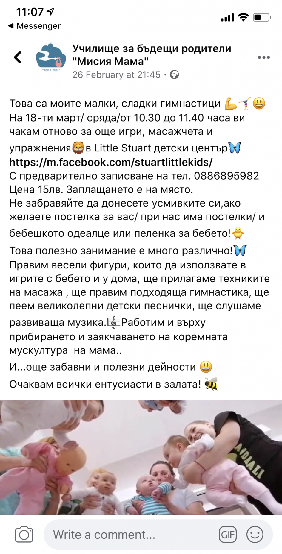 Мисля щом приключи грипната епидемия, да поразгледам за някакви занимания , като плуване , КиндиРу, гимнастика мама и бебе. Приятелка ми изпрати разни странички във фейса и инстаграм за различни събития за бебенца в София , останах много учудена колко много неща има вече , като концерт за бебета .