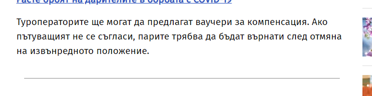 Да, да знам.Но сега вече официално така ще се процедира.Обаче се питам, ако юли, август вече не сме в извънредно положение, а искаме да анулираме почивките си дали ще важат тези условия?
